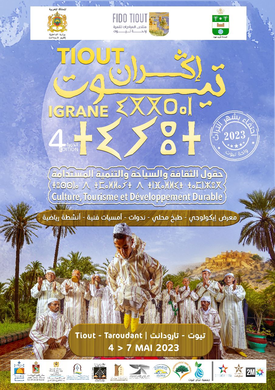 تستعد واحة تيوت التارايخية بإقليم تارودانت لتنظيم الدورة الرابعة لمهرجانها السنوي “إڭران تيوت : حقول الثقافة والسياحة والتنمية المستامة”، وذلك في الفترة ما بين  2 و7 ماي 2023. والذي ينظمه منتدى المبادرات لتنمية واحة تيوت بشراكة مع جماعة تيوت وبدعم من عمالة إقليم تارودانت، وبتعاون مع المجلس الجهوي والشركة الجهوية للتنمية السياحية لسوس ماسة والمجلس الإقليمي والمديرية الجهوية للثقافة (المحافظة الجهوية للتراث الثقافي)، ومركز سوس ماسة للتنمية الثقافية وشركاء آخرين؛ ويأتي تنظيم هذه الدورة في إطار الإحتفاء بشهر التراث وباليوم العالمي لشجرة الأركان، كما يتزامن النشاط مع تنزيل الشطر الأول لمشروع التهيئة السياحية لواحة تيوت، حيث أن مهرجان تيوت تجربة تؤسس لجيل جديد من المهرجانات التي تستهدف الإنعاش السياحي والإقتصادي لسكان الواحات عبر تثمين الإنسان والمجال والموروث المحلي.