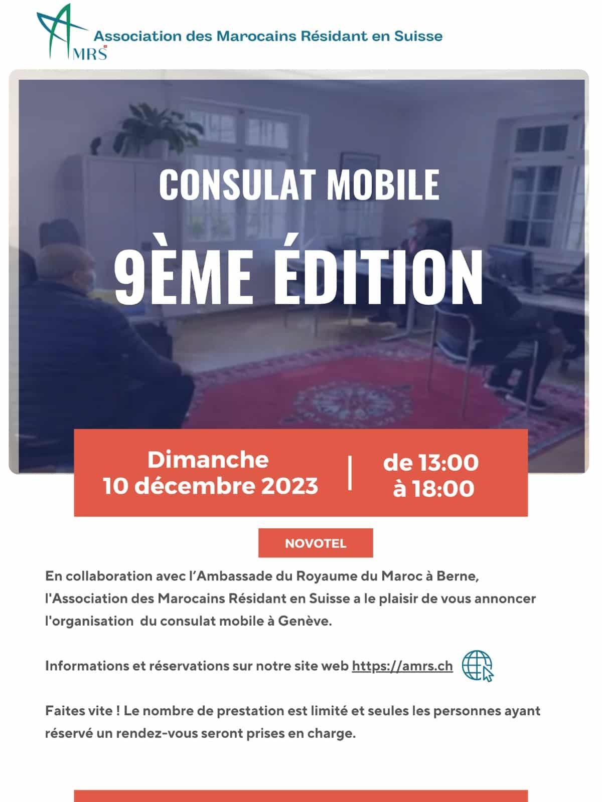 نظمت القنصلية العامة للمملكة المغربية بجنيف صباح يوم الأحد 10 دجنبر2023 بتنسيق مع جمعية المغاربة المقيمين بسويسرا قنصلية متنقلة في إطار دورتها التاسعة لتسهيل الإجراءات الإدارية لفائدة أفراد الجالية المغربية باعتماد الرقمنة. هذه الفعالية، التي حضرها سفير المملكة بسويسرا لحسن أزولاي ونائبه يوسف بوريطة والطاقم المرافق بالإضافة إلى رئيس الجمعيةتوفيق بلقاضي، تندرج في إطار سياسة القرب التي تنتهجها القنصلية العامة للمملكة.وقدمكنت هذه المبادرة التي رحب بها أفراد الجالية المغربية المقيمين في جنيف من تفادي عناء السفر إلى مقر القنصلية بمدينة بيرن.