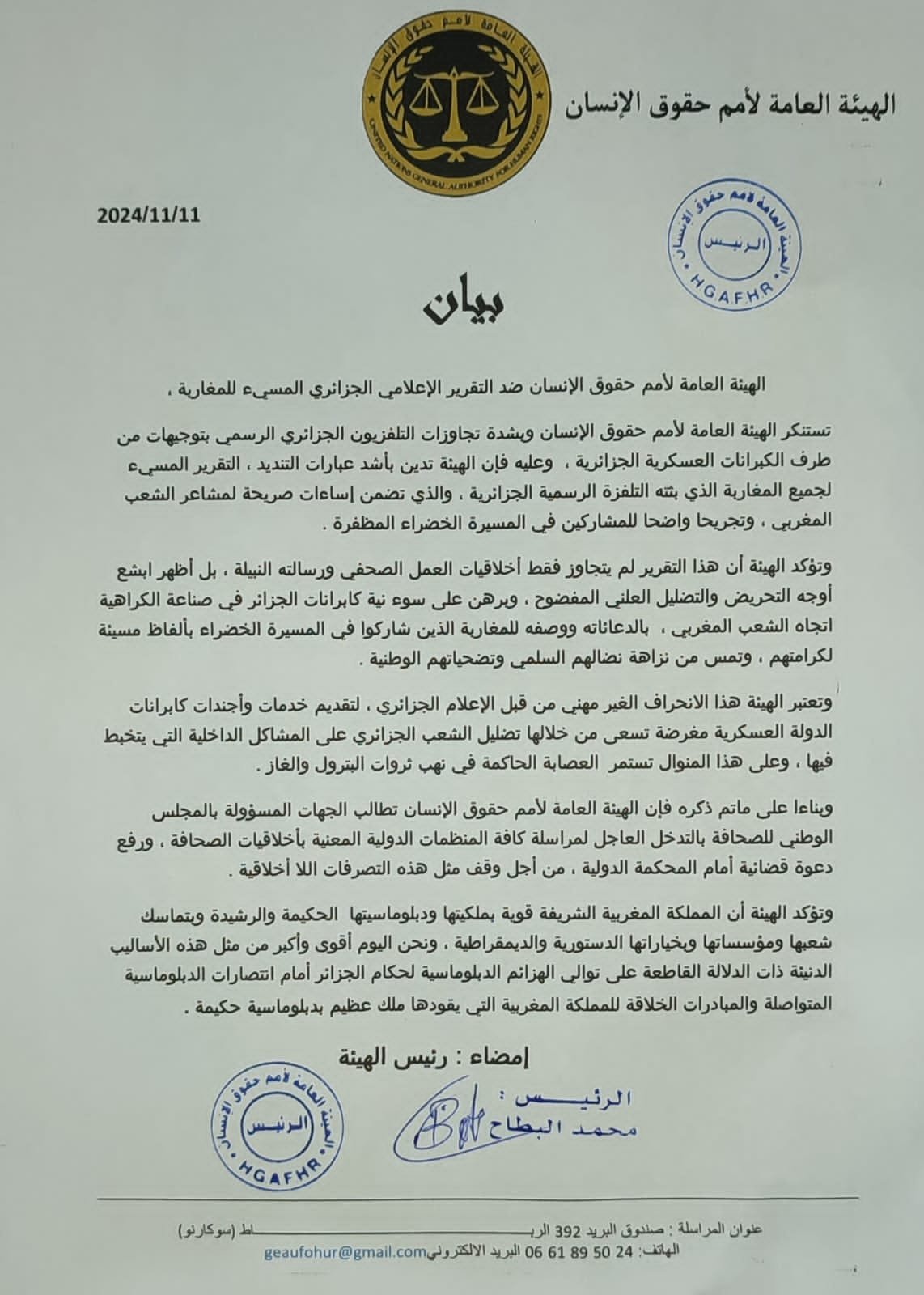 تستنكر الهيئة العامة لأمم حقوق الإنسان وبشدة تجاوزات التلفزيون الجزائري الرسمي بتوجيهات من طرف الكبرانات العسكرية الجزائرية، وعليه فإن الهيئة تدين بأشد عبارات التنديد ، التقرير المسيء الجميع المغاربة الذي بثته التلفزة الرسمية الجزائرية ، والذي تضمن إساءات صريحة لمشاعر الشعب المغربي، وتجريحا واضحا للمشاركين في المسيرة الخضراء المظفرة .