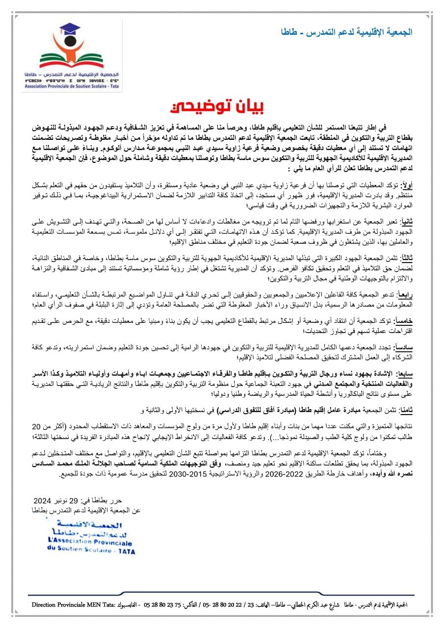 كما أثنت الجمعية على العمل الذي تقوم به المديرية الإقليمية، خصوصًا في المناطق النائية، لضمان حق التلاميذ في التعلم، مع تأكيدها على التزام المديرية برؤية شاملة تستند إلى الشفافية والنزاهة. ودعت الجمعية إلى ضرورة تحري الدقة عند تناول المواضيع المتعلقة بالشأن التعليمي، وتجنب الانسياق وراء الأخبار المغلوطة التي تضر بالمصلحة العامة.