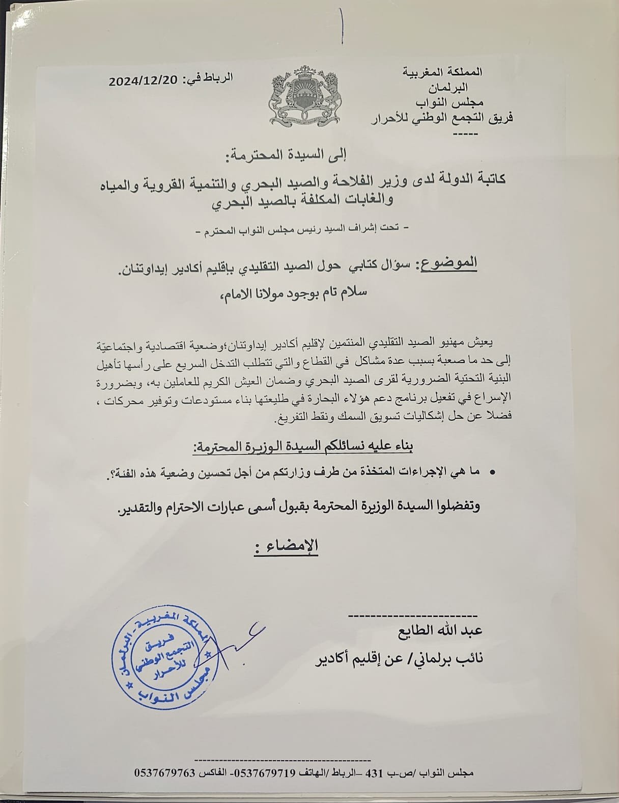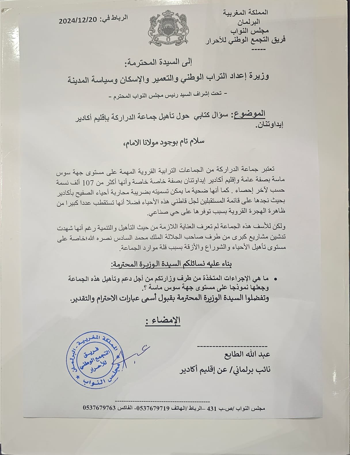 وجه السيد عبد الله الطايع، النائب البرلماني عن إقليم أكادير إيداوتنان، سؤالين كتابيين إلى كل من السيدة وزيرة إعداد التراب الوطني والتعمير والإسكان وسياسة المدينة، والسيدة كاتبة الدولة لدى وزير الفلاحة والصيد البحري والتنمية القروية والمياه والغابات المكلفة بالصيد البحري، تحت إشراف السيد رئيس مجلس النواب، بشأن قضايا حيوية تهم المنطقة.
