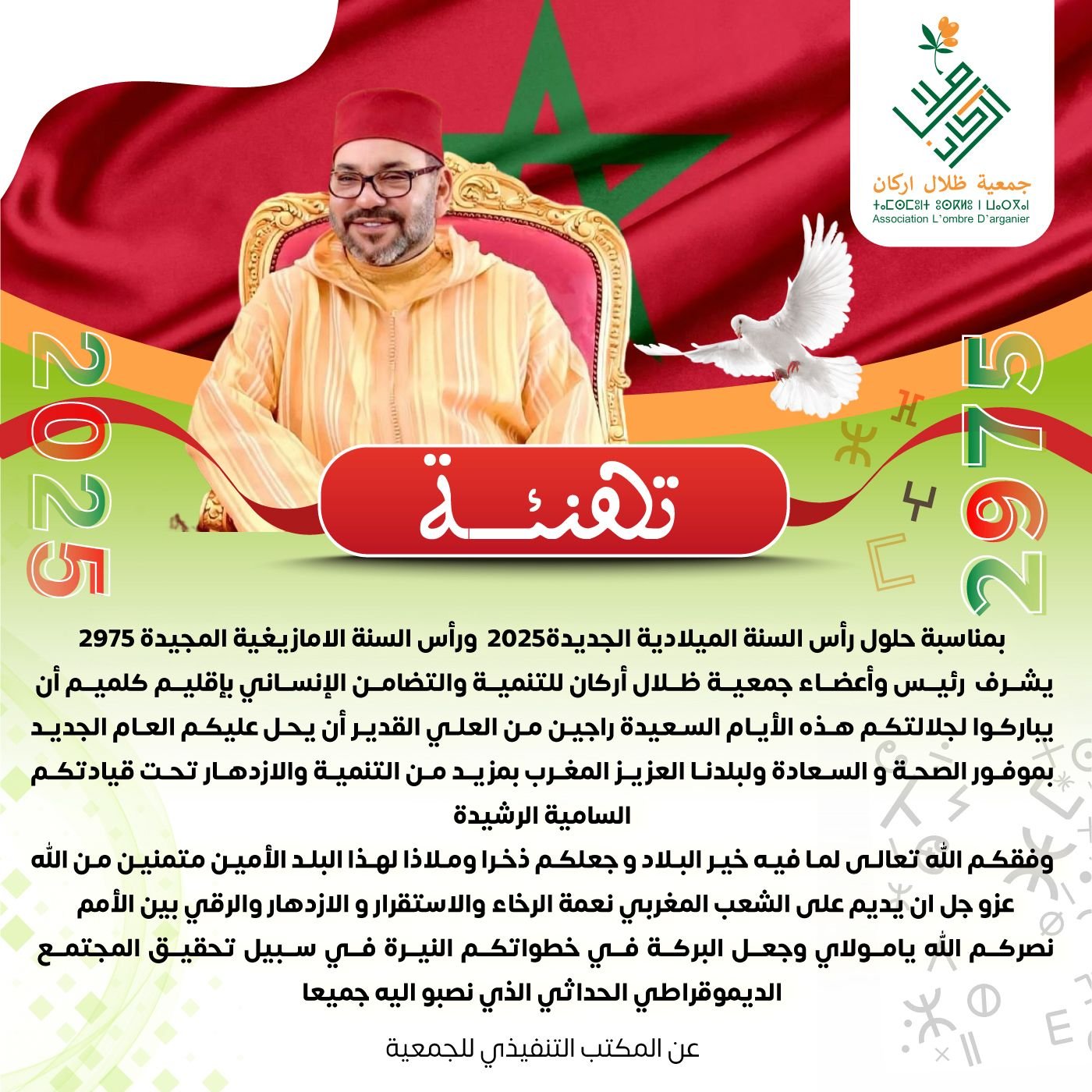 بمناسبة حلول رأس السنة الميلادية الجديدة 2025 ورأس السنة الامازيغية المجيدة 2975 يشرف رئيس وأعضاء جمعية ظلال أركان للتنمية والتضامن الإنساني بإقليم كلميم أن يباركوا لجلالتكم هذه الأيام السعيدة راجين من العلي القدير أن يحل عليكم العام الجديد بموفور الصحة وا السعادة ولبلدنا العزيز المغرب بمزيد من التنمية والازدهار تحت قيادتكم السامية الرشيدة