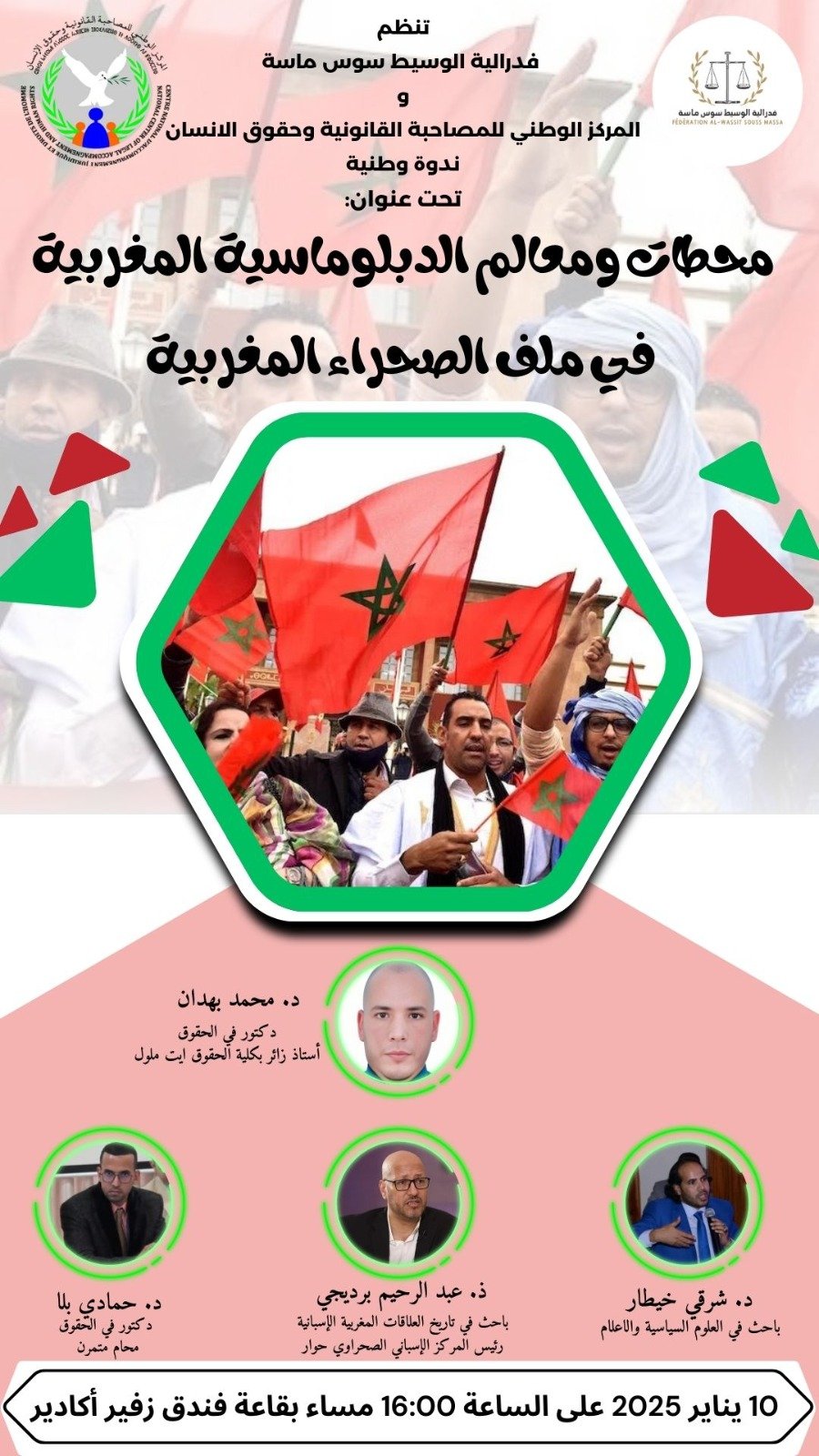 تحتضن مدينة أكادير، يوم 10 يناير المقبل، ندوة وطنية حول موضوع “محطات ومعالم الدبلوماسية المغربية في ملف الصحراء المغربية”، وذلك بفندق زفير على الساعة الرابعة زوالا.