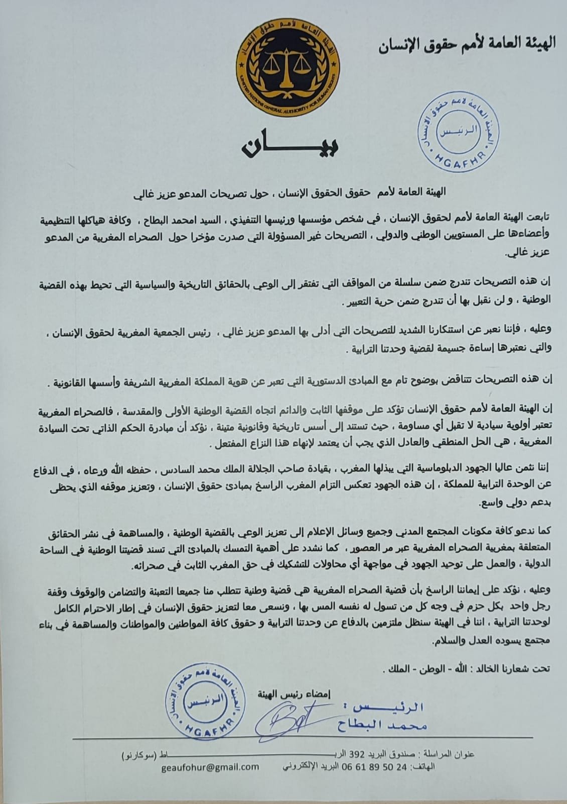 أصدرت الهيئة العامة لأمم حقوق الإنسان ، في شخص مؤسسها ورئيسها التنفيذي، السيد امحمد البطاح، وكافة هياكلها التنظيمية وأعضاءها على المستويين الوطني والدولي، بيانا حول التصريحات غير المسؤولة التي صدرت مؤخرا حول الصحراء المغربية من المدعو عزيز غالي.