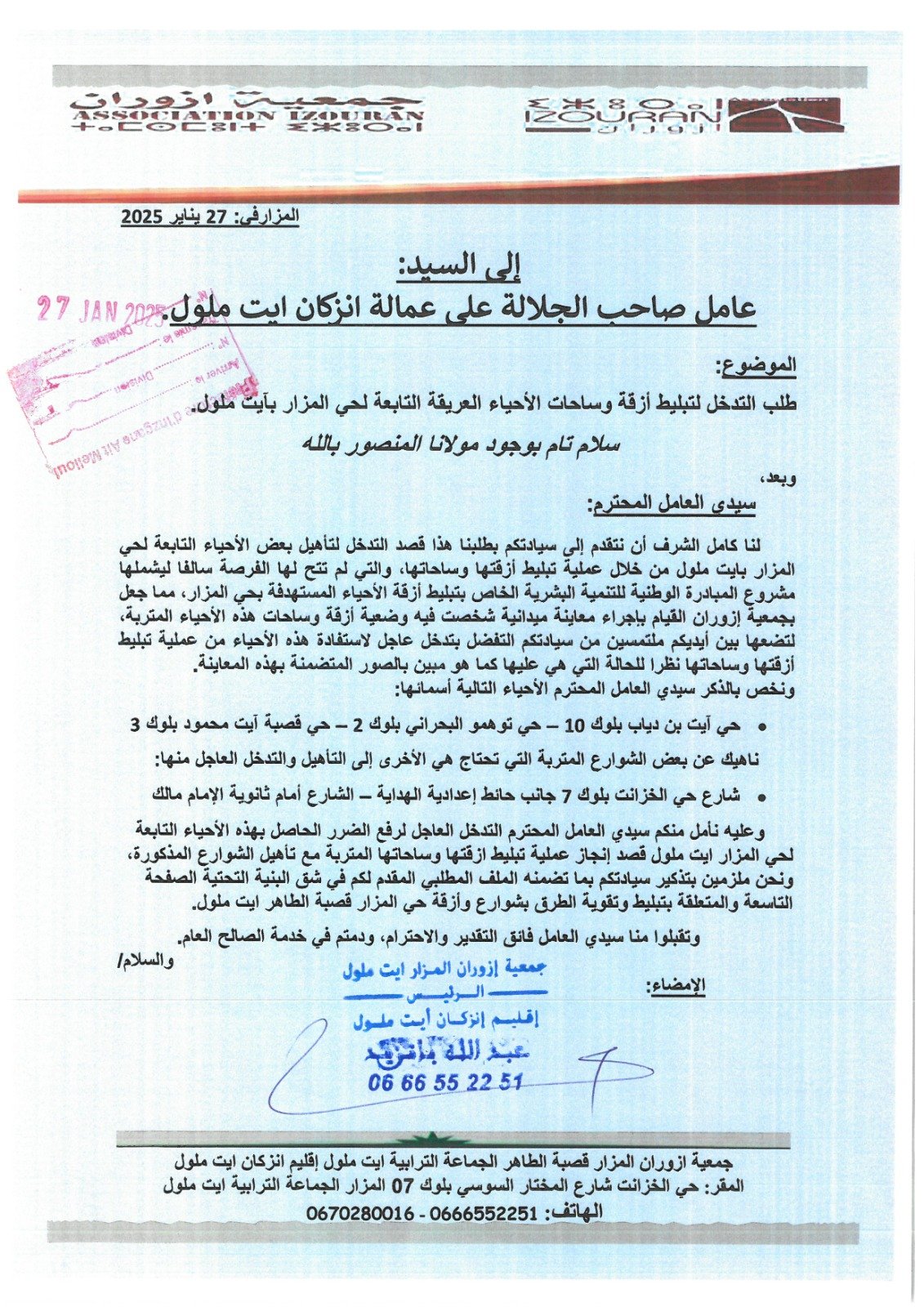 في إطار سعيها المستمر لتحسين جودة الحياة في منطقة أيت ملول، قامت الجمعية الإقليمية إزوران بحي المزار مؤخراً بإجراء معاينة ميدانية شاملة لأزقة وساحات عدة أحياء، منها حي آيت بادي بلوك 10، وحي توهمو البحراني بلوك 2، وحي قصبة آيت محمود بلوك 3، إضافة إلى تقييم الشوارع المهمة مثل شارع حي الخزانت بلوك 7 المجاور لحائط إعدادية الهداية والشوارع المجاورة لثانوية الإمام مالك.