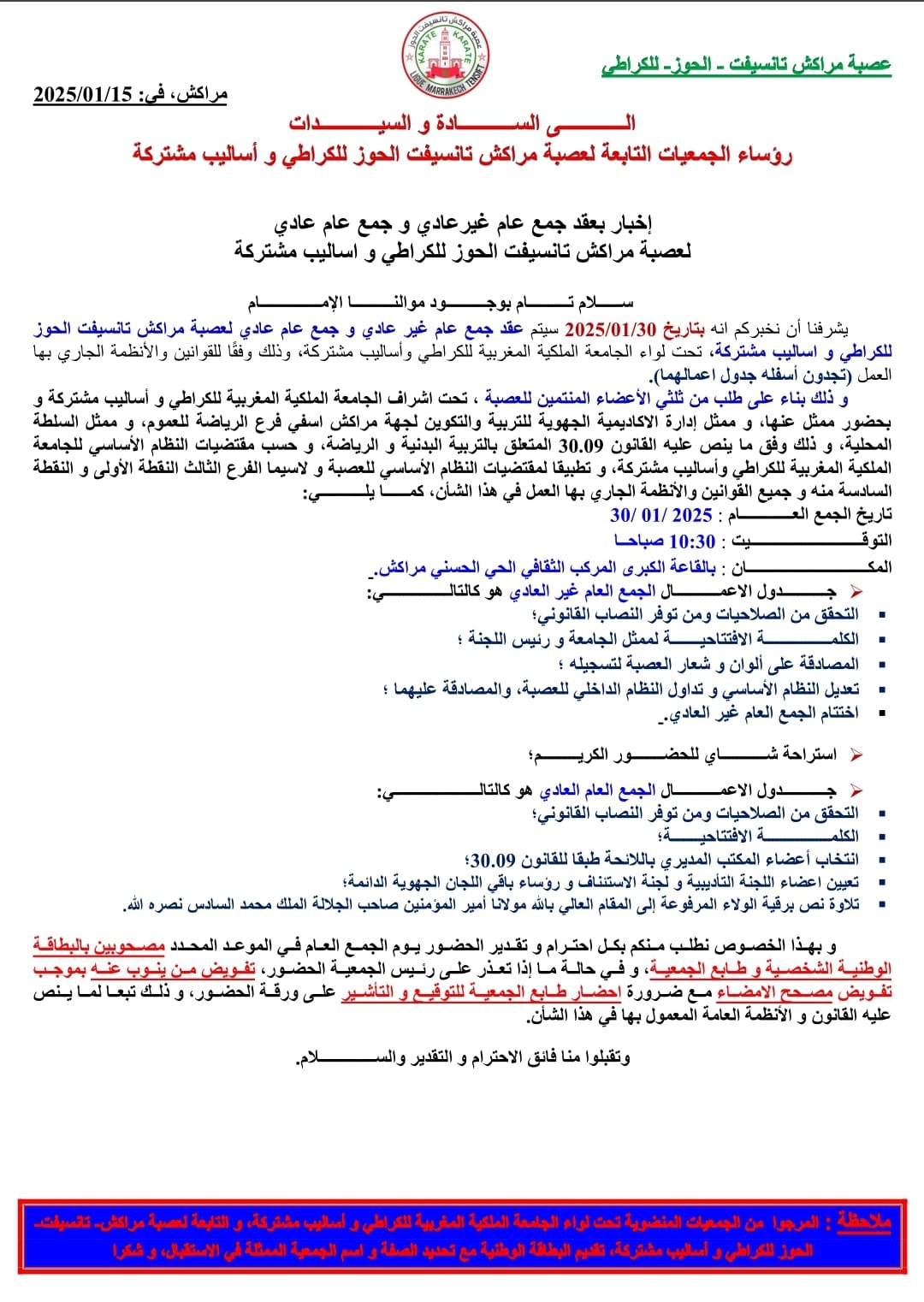 بمناسبة عقد الجمع العام غير العادي والجمع العام العادي لعصبة مراكش تانسيفت الحوز للكراطي وأساليب مشتركة، يسرنا دعوتكم لحضور وتغطية هذا الحدث الرياضي الهام، الذي سينعقد يوم الخميس 30 يناير 2025 بالمركب الثقافي الحي الحسني – مراكش على الساعة 10:00 صباحا.