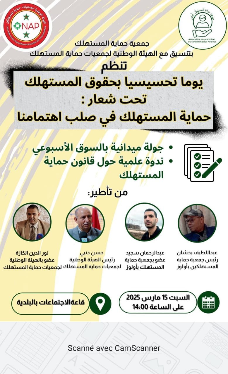 تحت شعار “حماية المستهلك في صلب اهتمامنا”، تنظم جمعية حماية المستهلك بأولوز، بتنسيق مع الهيئة الوطنية لجمعيات حماية المستهلك، يوما تحسيسيا يهدف إلى تعزيز الوعي بحقوق المستهلكين وتحسين جودة الخدمات المقدمة لهم. سيقام هذا الحدث يوم السبت الموافق 15 مارس 2025، على الساعة 14:00، بمقر بلدية أولوز، إقليم تارودانت.