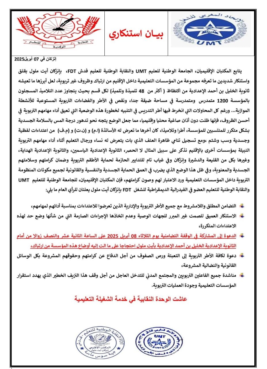 ردا على هذه الأوضاع، نظّم المكتبان الإقليميان لـUMT وFDT وقفة احتجاجية يوم الثلاثاء 08 أبريل 2025 أمام ثانوية الخليل بن أحمد، للتعبير عن التضامن مع الضحايا ومطالبة الجهات المعنية بالتحرك العاجل.