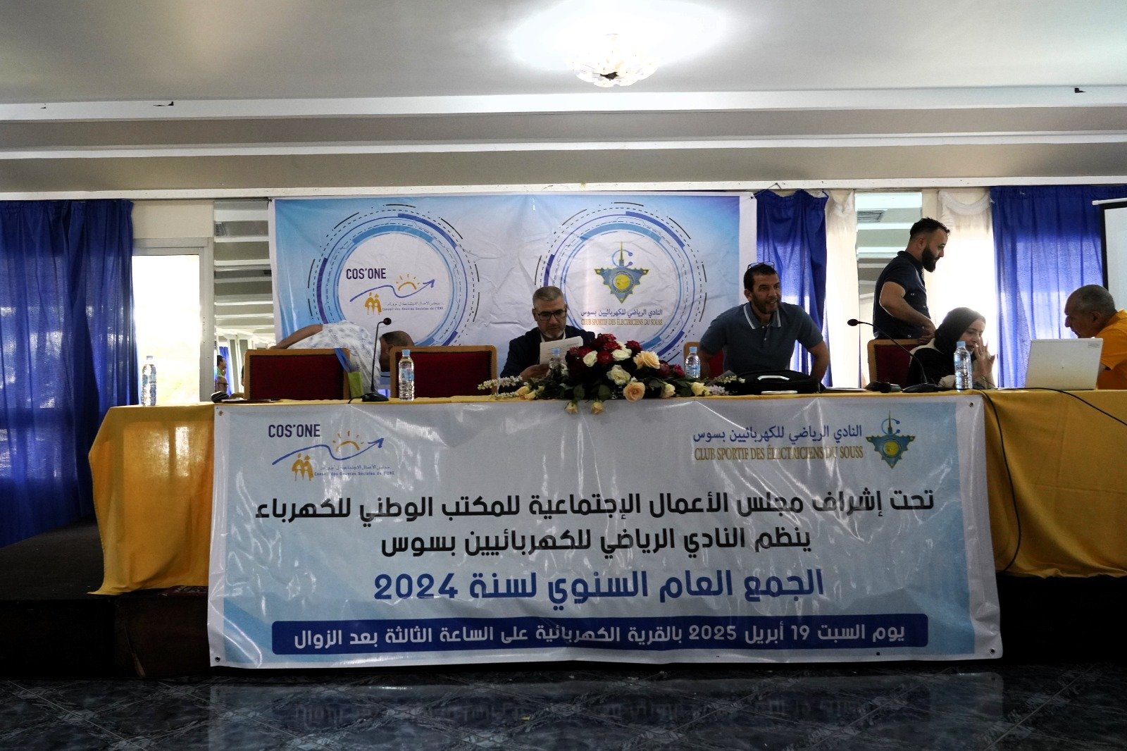 انعقد يوم السبت 19 أبريل 2025 بالقرية الكهربائية بأكادير ، الجمع العام السنوي للنادي الرياضي للكهربائيين بسوس لموسم 2024، وذلك بحضور مهم ووازن لمستخدمي مديرية النقل، الشركة الجهوية متعددة الخدمات سوس ماسة، التعاضدية ، الانتاج، القرية الكهربائية و المتقاعدين. وقد ترأس أشغال هذا الجمع الأخ محمد كجة وعلي اعباد، ممثلي مجلس الأعمال الاجتماعية.