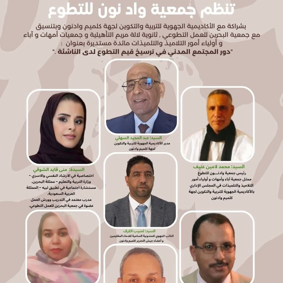 تحت شعار “التطوع عطاء، بناء وارتقاء”، تنظم جمعية وادنون للتطوع، بشراكة مع الأكاديمية الجهوية للتربية والتكوين بكلميم وادنون، وتنسيق مع جمعية البحرين للعمل التطوعي وثانوية لالة مريم التأهيلية، وجمعيات آباء وأمهات وأولياء أمور التلاميذ، مائدة مستديرة بعنوان: “دور المجتمع المدني في ترسيخ قيم التطوع لدى الناشئة”.