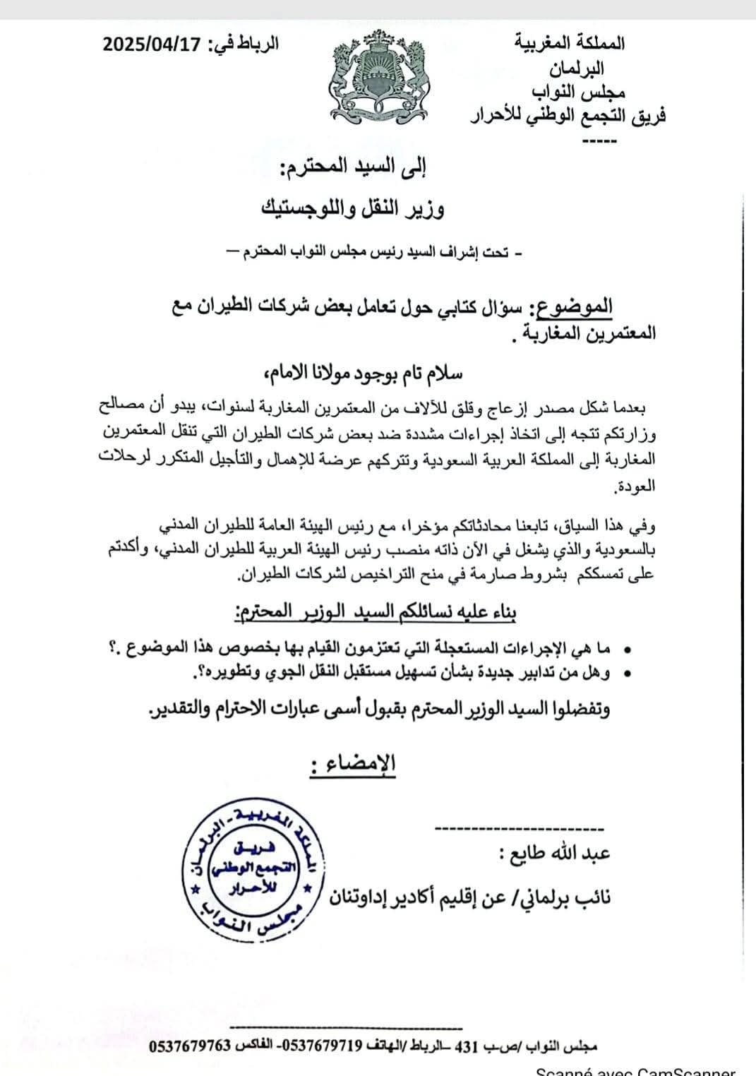 وجه النائب البرلماني عبدالله طايع سؤالا كتابيا إلى وزير النقل واللوجستيك، تحت إشراف رئيس مجلس النواب، بخصوص الظروف غير الملائمة التي يعيشها عدد من المعتمرين المغاربة بسبب تعامل بعض شركات الطيران.
