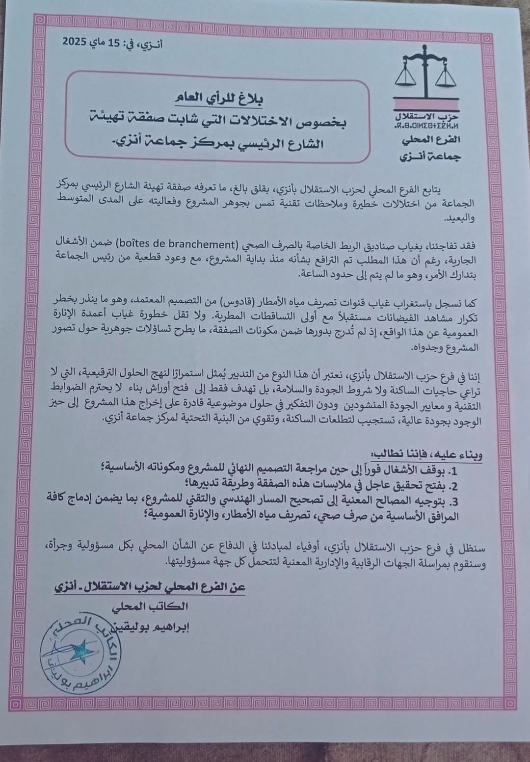 حزب الاستقلال بأنزي: ‘لا نقبل بأشغال ترقيعية!’