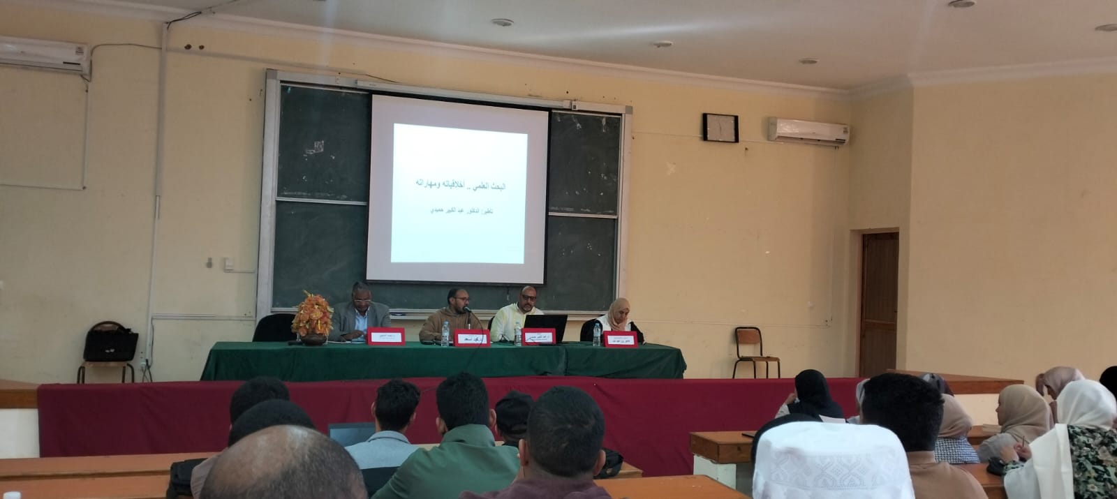 وختم الدكتور حميدي محاضرته بذكر شروط حاسمة لنجاح العمل البحثي، وهي إعادة قراءة نصوص البحث كلما تيسر وتدوين الملاحظات، الاستفادة من المشرف الى ابعد حد ممكن، الاطلاع على بحوث علمية سابقة والإفادة من اهل التخصص والسبق، وتعلم الرقن بالحاسوب لكتابة البحث.