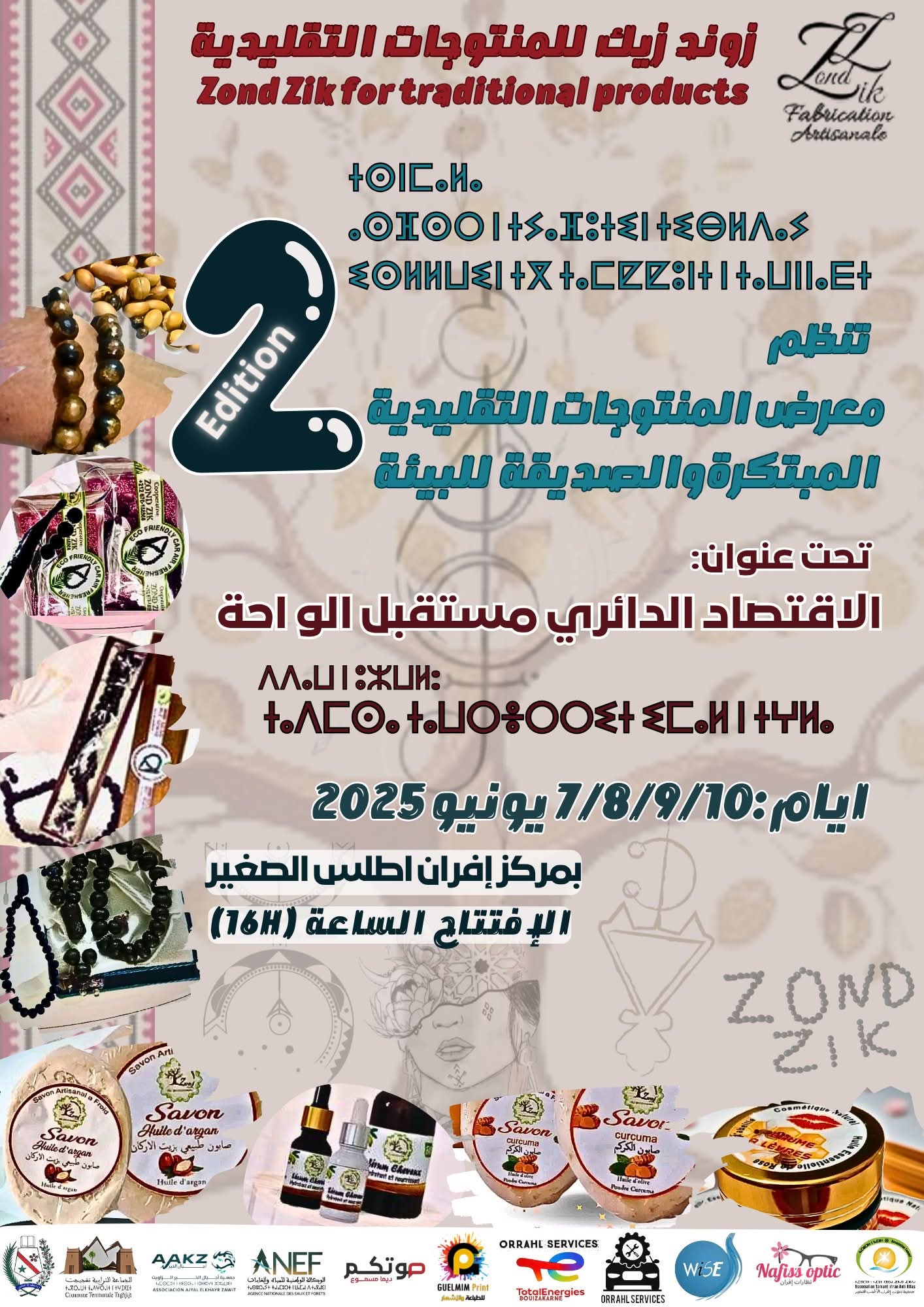 في إطار الجهود الرامية إلى تعزيز الاقتصاد المحلي وتثمين التراث الثقافي والبيئي للواحات، تنظم جمعية زوند زيك النسخة الأولى من معرض المنتوجات التقليدية المبتكرة والصديقة للبيئة، وذلك خلال الفترة الممتدة من 7 إلى 10 يونيو 2025 بـمركز إفران الأطلس الصغير، تحت شعار: “الاقتصاد الدائري مستقبل الواحة”.
