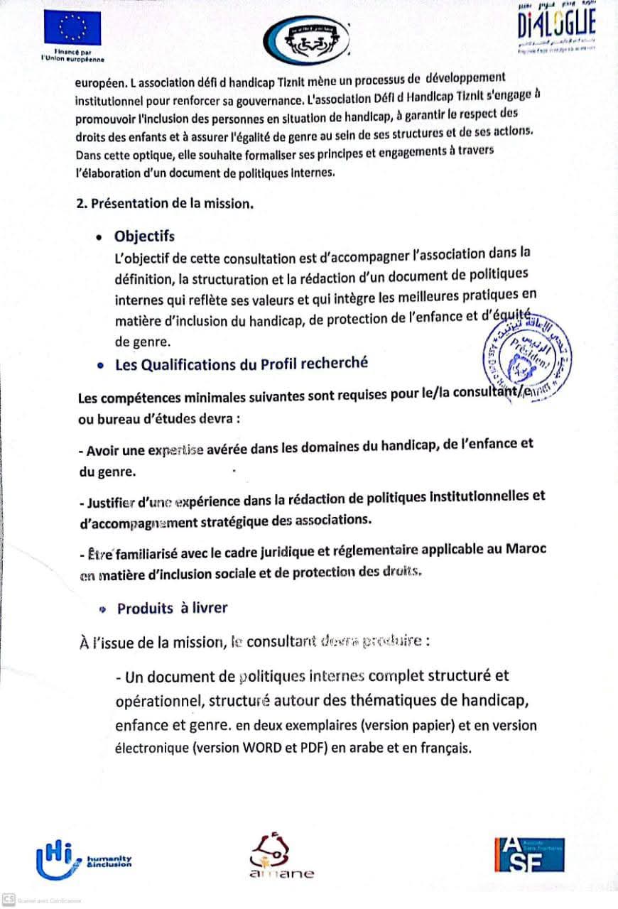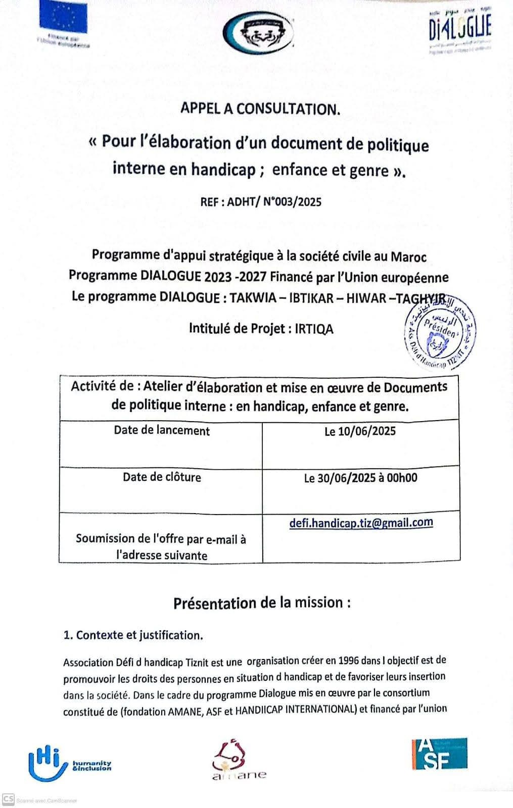 في إطار تعزيز حكامتها الداخلية وتطوير رؤيتها الاستراتيجية، تعلن جمعية تحدي الإعاقة بتزنيت عن إطلاق طلب عروض لانتقاء مكتب دراسات أو خبير مختص، وذلك بهدف مواكبة الجمعية في بلورة إطار مرجعي لسياستها الداخلية في مجالات الإعاقة، الطفولة، ومقاربة النوع.