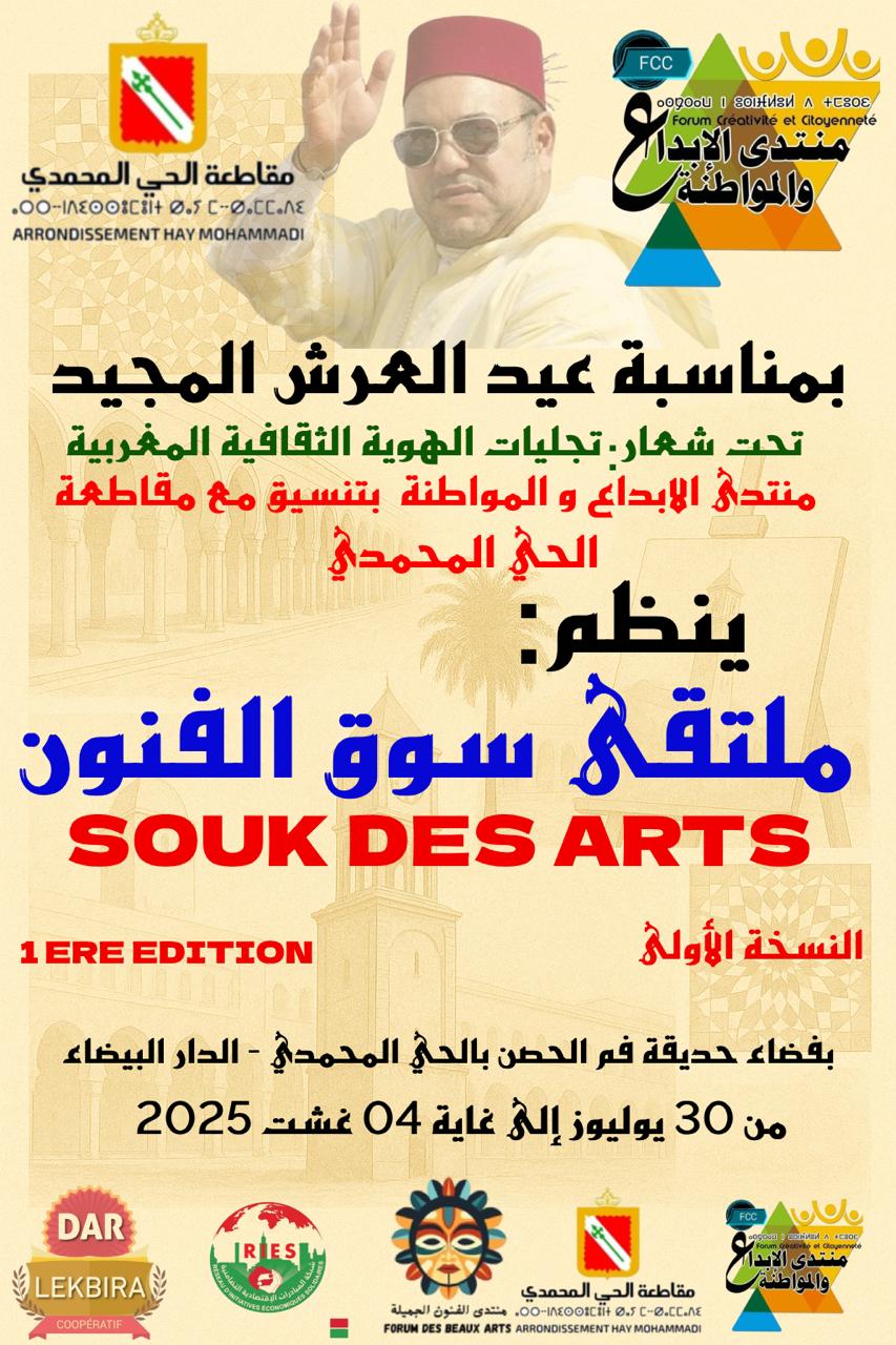 بمناسبة عيد العرش المجيد، ينظم منتدى الإبداع والمواطنة بتنسيق مع كل من مقاطعة الحي المحمدي وعمالة مقاطعات عين السبع الحي المحمدي، الملتقى الوطني الأول لسوق الفنون تحت شعار: “تجليات الهوية الثقافية المغربية”. يهدف هذا الملتقى إلى تعزيز الإبداع الفني والموروث الثقافي المغربي، وتقديم منصة للفنانين والحرفيين لعرض أعمالهم وتبادل الخبرات، مع التركيز على الأبعاد السوسيو-اقتصادية والتضامن الاجتماعي.