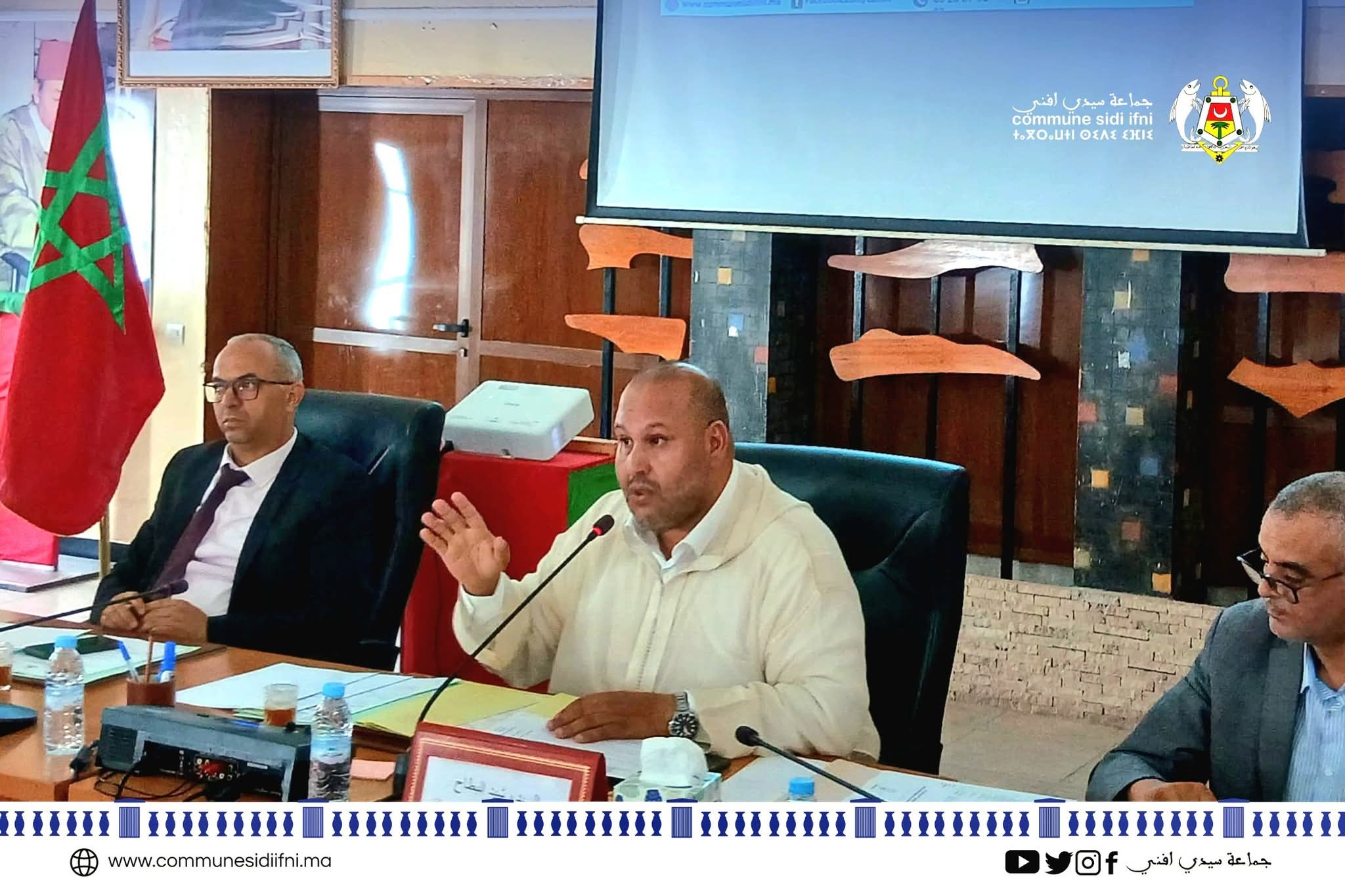 تطبيقا لمقتضيات المادة 36 من الظهير الشريف رقم 1.15.85 الصادر في 20 من رمضان 1436 الموافق ل 07 يوليوز 2015 بتنفيذ القانون التنظيمي رقم 113.14 المتعلق بالجماعات، عقد المجلس الجماعي لمدينة سيدي افني دورة إستثنائية يومه الجمعة 08 غشت 2025 بقاعة المسيرة الخضراء التابعة للجماعة، برئاسة السيد رشيد البطاح رئيس المجلس الجماعي و بحضور السيد باشا المدينة بالإضافة الى السادة أعضاء المجلس الجماعي، كما حضر السيد ممثل وزارة التربية والتعليم الاولي والرياضة إلى جانب أطر وموظفي الجماعة.