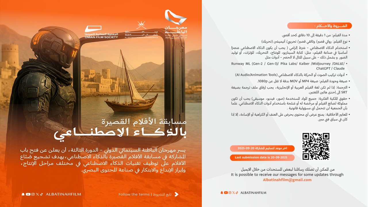 أعلنت الجمعية العُمانية للسينما عن إطلاق مسابقة الأفلام القصيرة بالذكاء الاصطناعي، التي تُقام لأول مرة ضمن فعاليات مهرجان الباطنة السينمائي الدولي – الدورة الثالثة، المقرر انعقاده خلال الفترة من 27 إلى 30 أكتوبر 2025، بمشاركة نخبة من صنّاع الأفلام المحليين والدوليين.