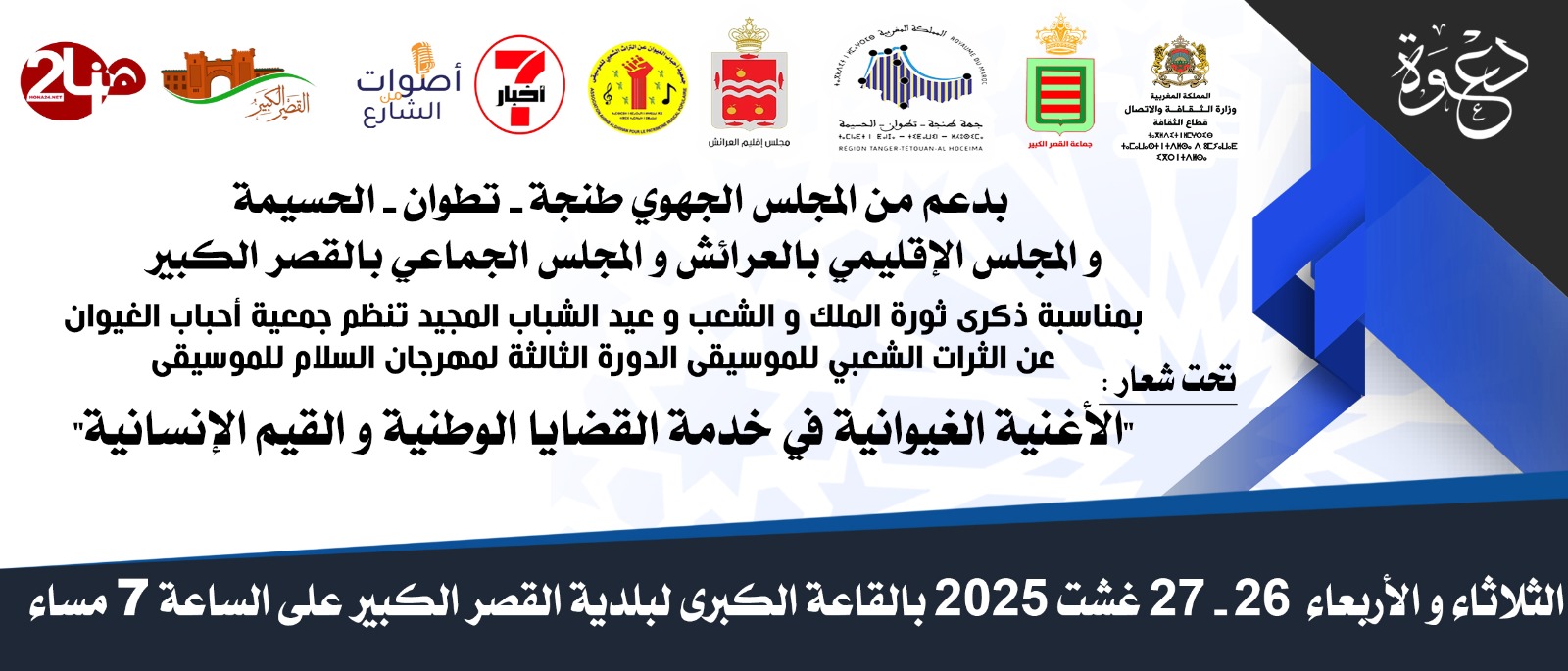 وتعرف هذه الدورة، التي ستقام يومي الثلاثاء والأربعاء 26 و27 غشت 2025 بقاعة بلدية القصر الكبير، مشاركة ثلة من المجموعات الغيوانية والفنية المرموقة.