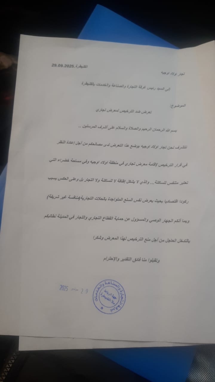 في خطوة احتجاجية غير مسبوقة، وقّع 150 من تجار وأصحاب محلات بمنطقة أولاد وجيه على عريضة رسمية عبّروا فيها عن رفضهم القاطع لما أسموه “الاستغلال غير المشروع للملك العمومي”، بعد الترخيص لإقامة معرض تجاري وسط حديقة عمومية بالمدينة.