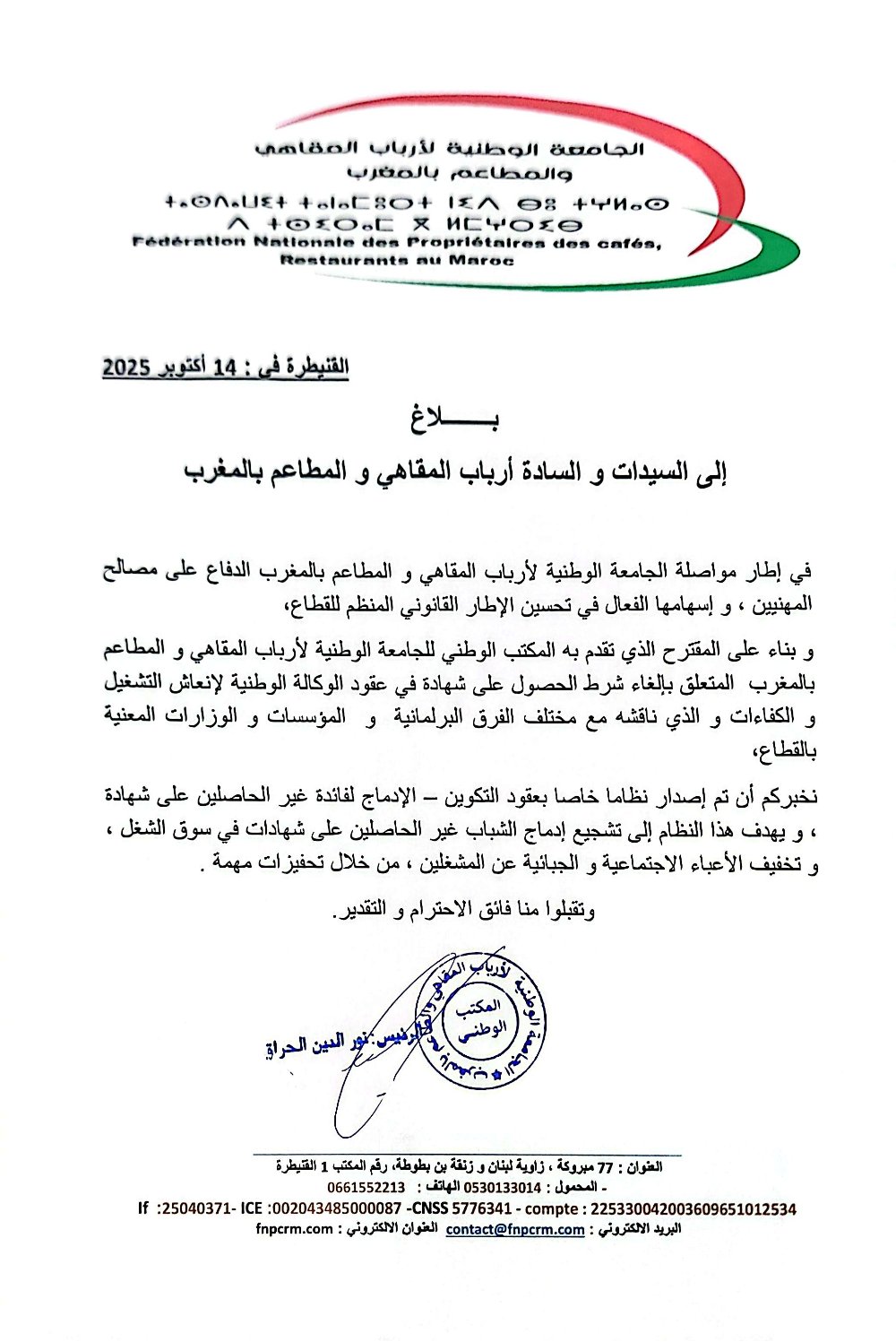بلاغ هام من الجامعة الوطنية لأرباب المقاهي والمطاعم يدعو إلى تحسين الإطار القانوني للقطاع
