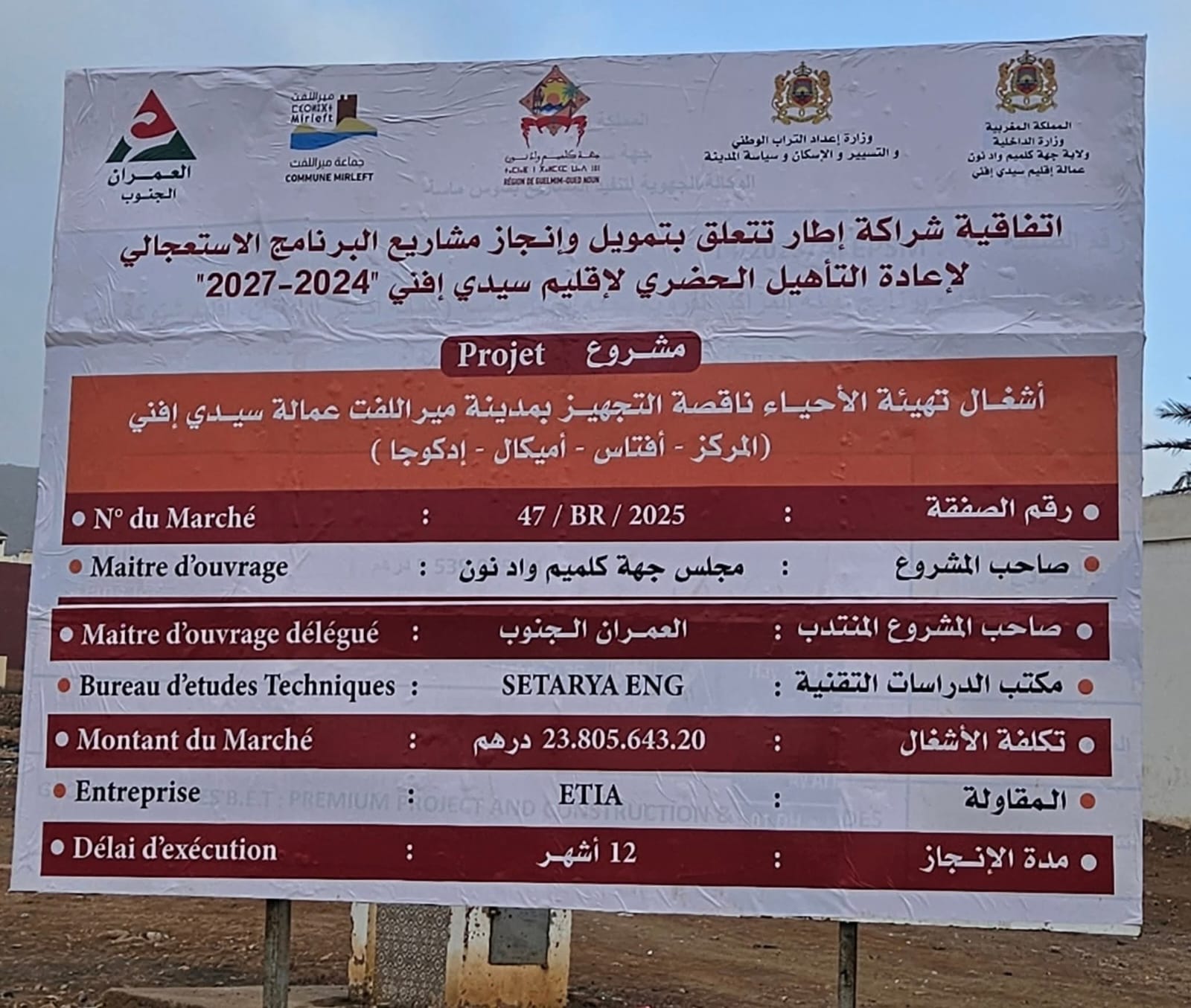 وتشكل هذه الاتفاقية ثمرة تعاون بين مجموعة من الشركاء المؤسساتيين، من ضمنهم وزارة إعداد التراب الوطني والتعمير والإسكان وسياسة المدينة، ومجلس جهة كلميم وادنون، والوكالة الحضرية لسيدي إفني وعمالة إقليم سيدي إفني، والجماعات الترابية المعنية.