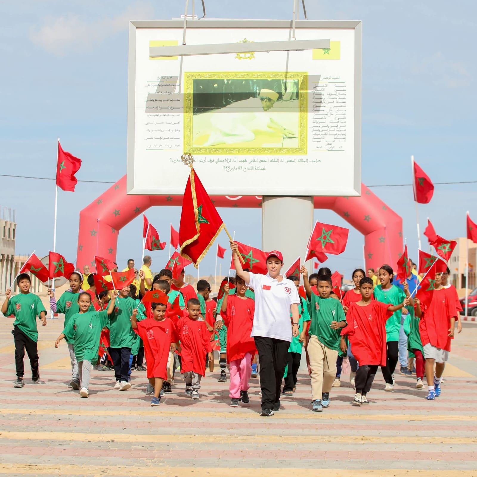 وكان هؤلا التلاميذ والتلميذات في قمة البهجة والسرور حينما رافقوا حاملة العلم الوطني في المرحلة ال 12 الرابطة بين طرفاية والعيون، البطلة العالمية زهرة وعزيز، وركضوا إلى جانبها بعض مئات الأمتار وأخذوا صورا تذكارية مع رئيسة الجامعة الملكية المغربية للرياضة للجميع، السيدة نزهة بدوان ، وأعضاء المكتب المديري للجامعة وطاقميها الإداري والتقني .