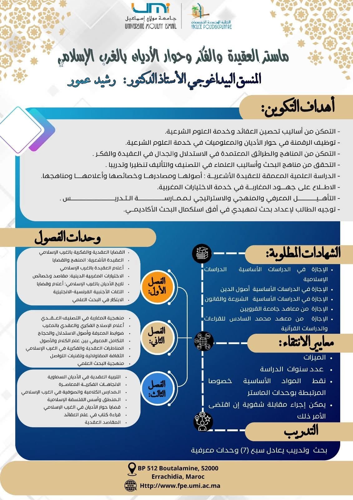 أعلنت الكلية متعددة التخصصات بمدينة الرشيدية، التابعة لجامعة مولاي إسماعيل، عن فتح باب التسجيل في ماستر “العقيدة والفكر وحوار الأديان بالغرب الإسلامي” برسم الموسم الجامعي الحالي، تحت إشراف المنسق البيداغوجي الأستاذ الدكتور رشيد عمور.
