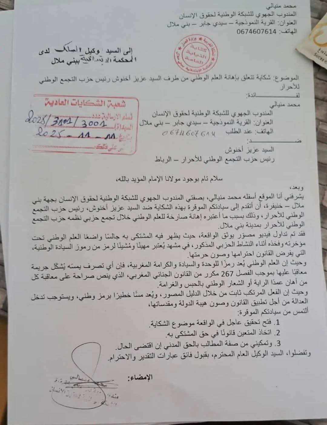 تقدم اليوم الثلاثاء 11 نونبر 2025 الحقوقي محمد منيالي، المندوب الجهوي للشبكة الوطنية لحقوق الإنسان بمدينة بني ملال، بشكاية رسمية إلى السيد وكيل الملك لدى محكمة الاستئناف ببني ملال ضد رئيس الحكومة والأمين العام لحزب التجمع الوطني للأحرار، عزيز أخنوش، يتهمه فيها بـ إهانة العلم الوطني.