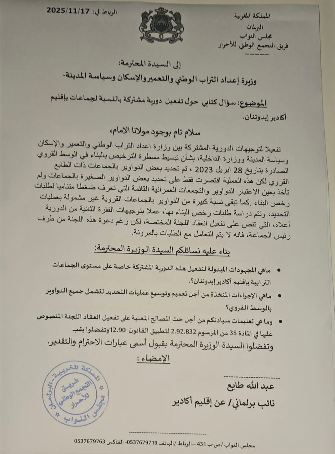 وجه النائب البرلماني عبد الله طايع، ممثل إقليم أكادير إداوتنان، سؤالا كتابيا إلى وزيرة إعداد التراب الوطني والتعمير والإسكان وسياسة المدينة، بخصوص الصعوبات التي تعترض تنزيل الدورية المشتركة الصادرة في 28 أبريل 2023، والمتعلقة بتبسيط مسطرة الترخيص بالبناء في الوسط القروي.