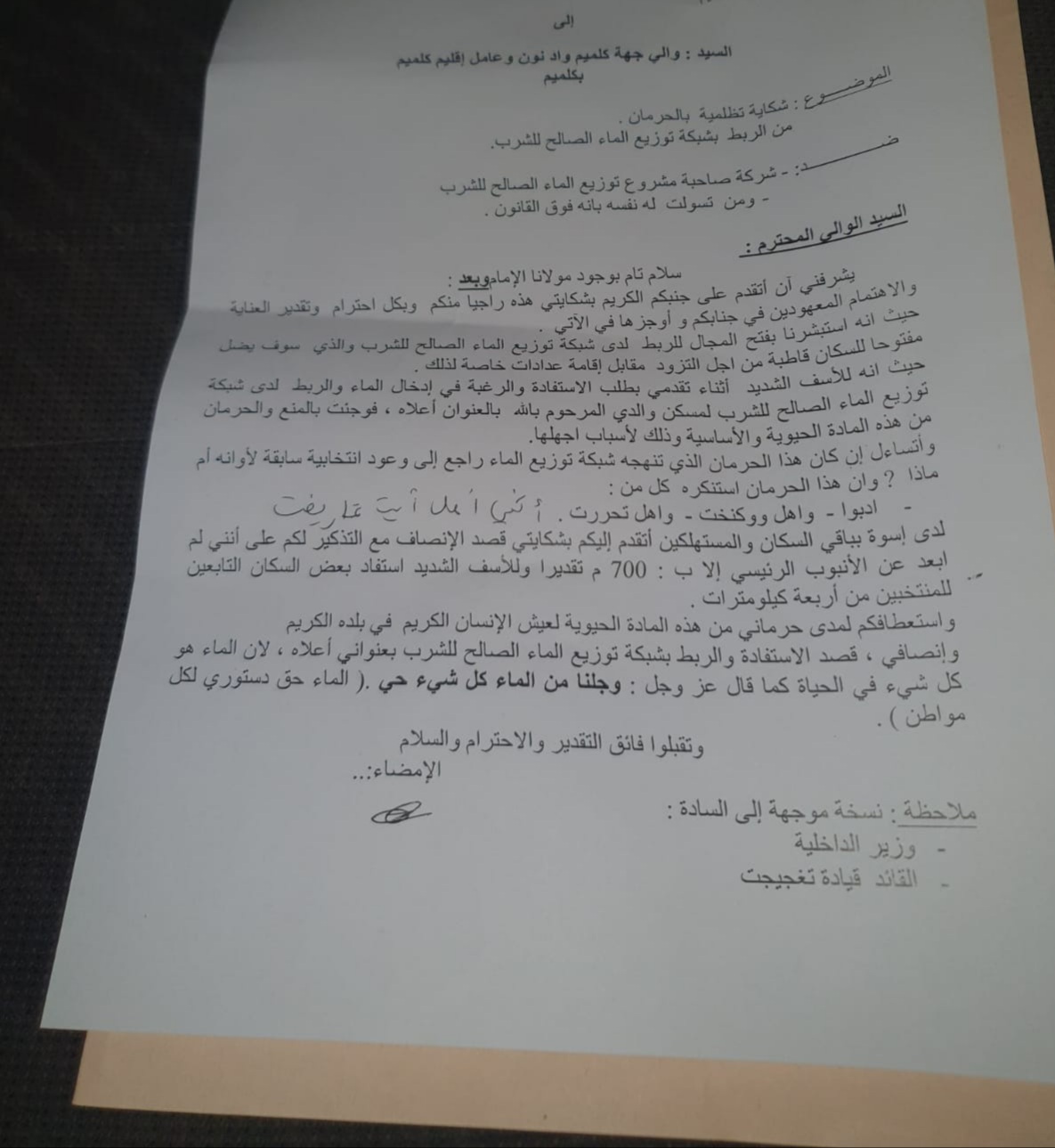 تأتي شكاية السيد بوفوس الموجهة إلى والي جهة كلميم وادنون وعامل الإقليم،لتكشف عن معاناة حقيقية. بعد استبشار السكان بإنجاز الشبكة، فوجئ هو بالمنع والحرمان من الالتحاق بها، دون معرفة الأسباب. يتساءل المواطن: هل هذا الحرمان سياسي، مرتبط “بوعود انتخابية سابقة لأوانها”؟ أم هو مجرد إجراء تعسفي؟