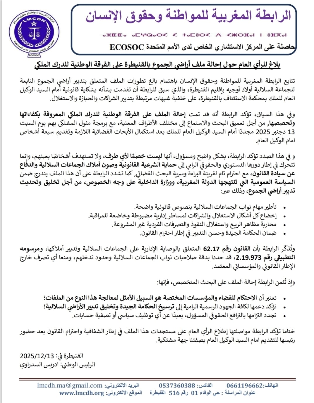 بلاغ للرأي العام حول إحالة ملف أراضي الجموع بالقنيطرة على الفرقة الوطنية للدرك الملكي