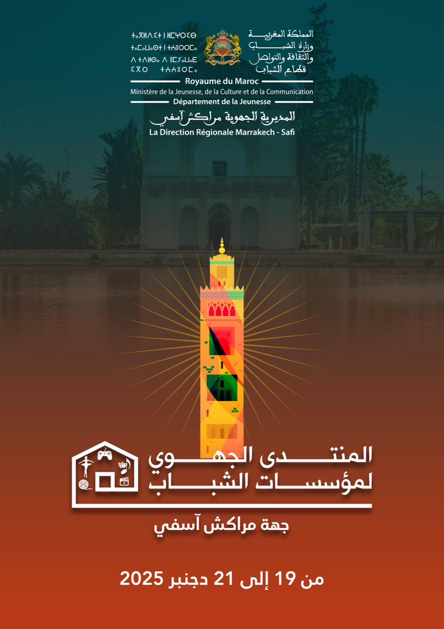 في إطار العناية المولوية السامية التي يوليها صاحب الجلالة الملك محمد السادس نصره الله وأيده لقضايا الشباب، وتنزيلًا للتوجيهات العامة لوزارة الشباب والثقافة والتواصل – قطاع الشباب، وتنفيذًا لمقتضيات المرسوم رقم 2.21.519 الصادر بتاريخ 3 غشت 2022 المتعلق بتنظيم مؤسسات الشباب، تعلن المديرية الجهوية لقطاع الشباب بجهة مراكش آسفي عن تنظيم المنتدى الجهوي لمؤسسات الشباب، وذلك يوم 20 دجنبر 2025.
