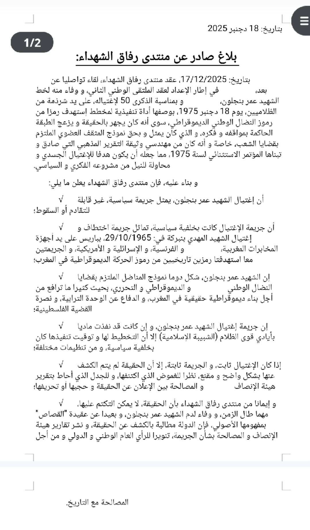 الوفاء الحقيقي لعمر بنجلون لا يكون بإحياء الذكرى، بل بإحياء الحقيقة. بفتح الأرشيف، وبكشف كل المسؤوليات، وبالاعتراف الصريح بأن الاغتيال كان جريمة سياسية هدفت إلى كسر مسار ديمقراطي ناشئ. فالديمقراطية لا تُبنى فوق النسيان، ولا تستقيم دون مواجهة شجاعة مع الماضي.