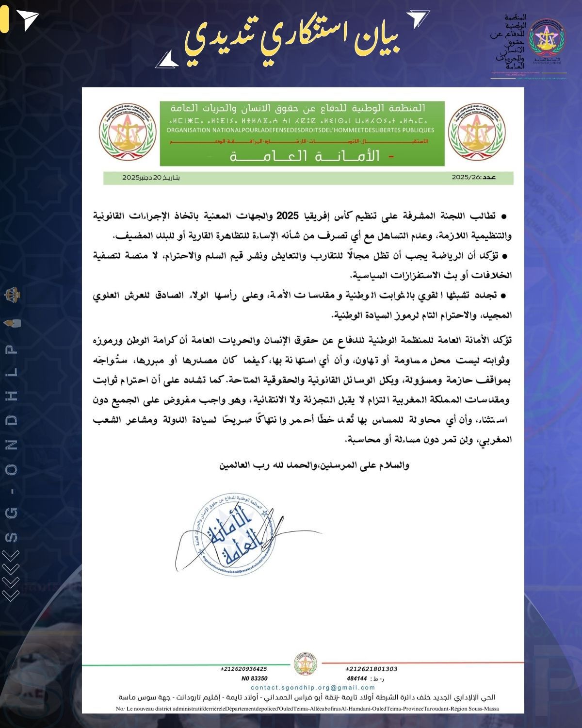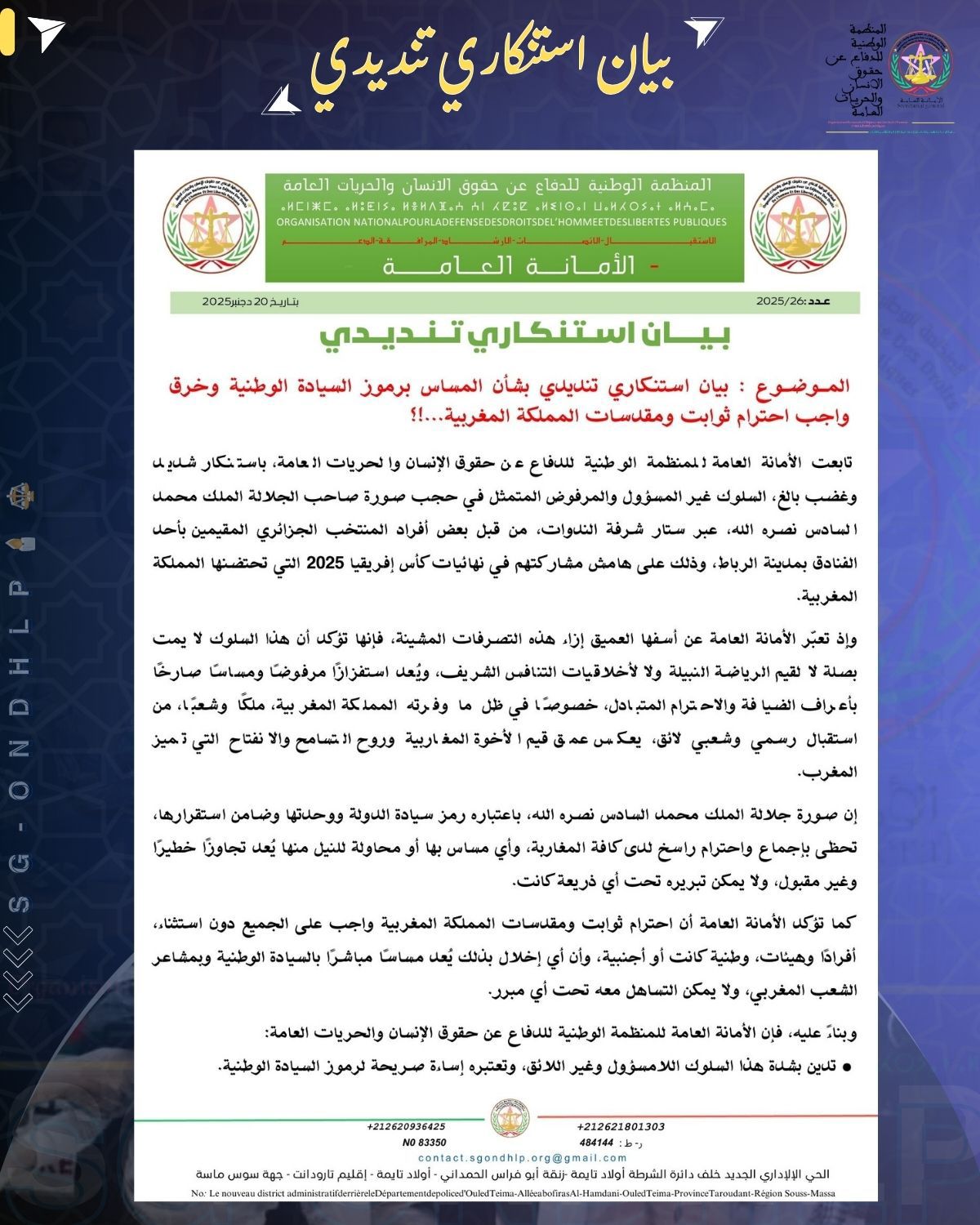 تتابع الأمانة العامة للمنظمة الوطنية للدفاع عن حقوق الإنسان والحريات العامة باستنكار شديد السلوك غير المسؤول المتمثل في المساس برموز السيادة الوطنية، وذلك على هامش بعض التظاهرات الرياضية التي تحتضنها المملكة المغربية.