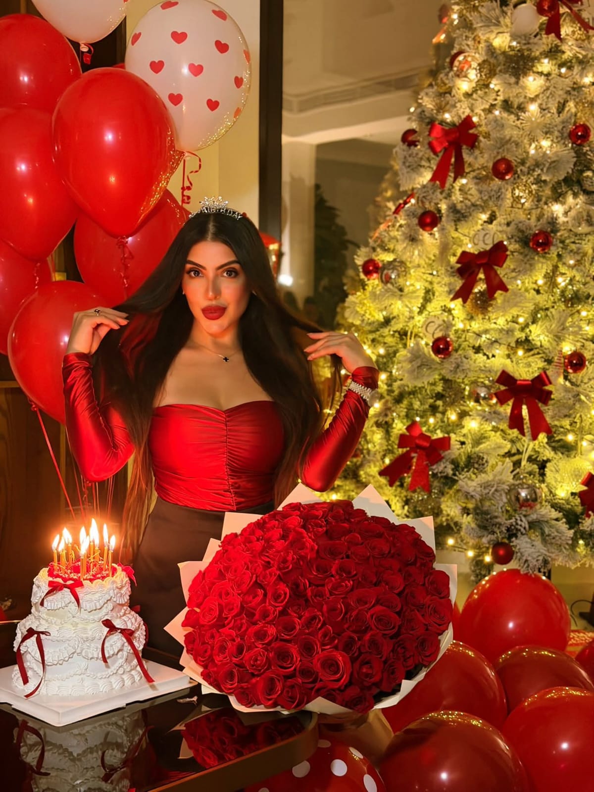 وظهرت دعاء وسط شجرة الكريسماس المزينة، محاطة بالورود والبالونات، في مشهد لافت جمع بين البساطة والأناقة.
