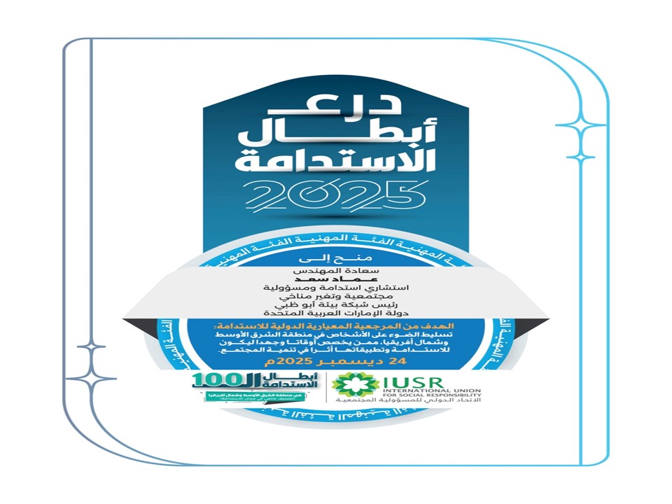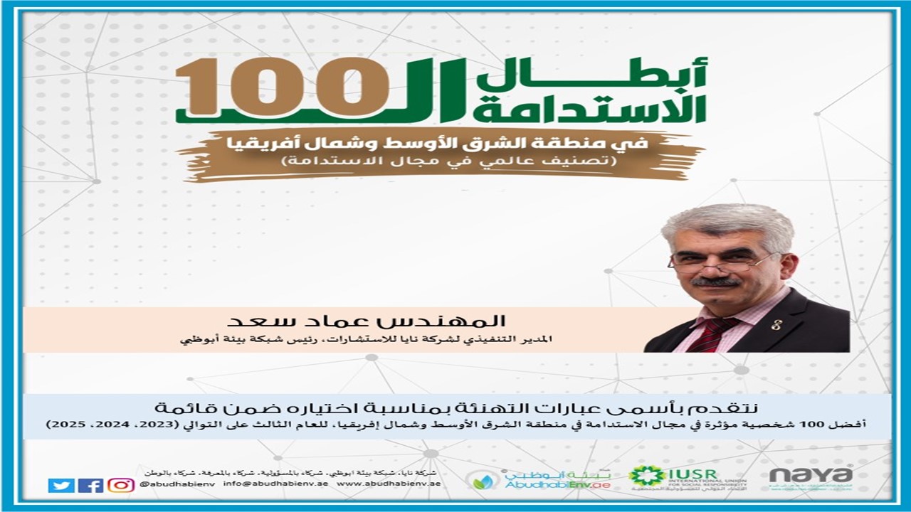 تحتفي شبكة بيئة أبوظبي اليوم بإنجاز عربي جديد، يتمثل في اختيار المهندس عماد سعد ضمن قائمة أبطال الاستدامة لعام 2025 في منطقة الشرق الأوسط وشمال إفريقيا، والتي يمنحها الاتحاد الدولي للمسؤولية المجتمعية، ويأتي هذا التكريم للعام الثالث على التوالي (2025 – 2024 – 2023)، في تأكيدٍ على دوره الريادي وتأثيره المستدام في قيادة الوعي البيئي والعمل المناخي في العالم العربي.