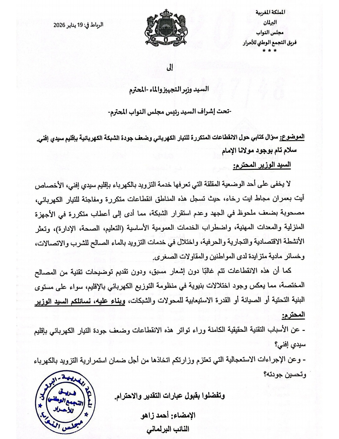 وفي هذا السياق، وجه النائب البرلماني عن إقليم سيدي إفني، أحمد زاهو، سؤالا كتابيا إلى السيد وزير التجهيز والماء، تحت إشراف السيد رئيس مجلس النواب، استفسره فيه عن الأسباب التقنية الحقيقية الكامنة وراء تواتر هذه الانقطاعات وضعف جودة التيار الكهربائي بالإقليم، كما تساءل عن الإجراءات الاستعجالية التي تعتزم الوزارة اتخاذها من أجل ضمان استمرارية التزويد بالكهرباء وتحسين جودته بما يستجيب لانتظارات الساكنة ويواكب متطلبات التنمية المحلية.