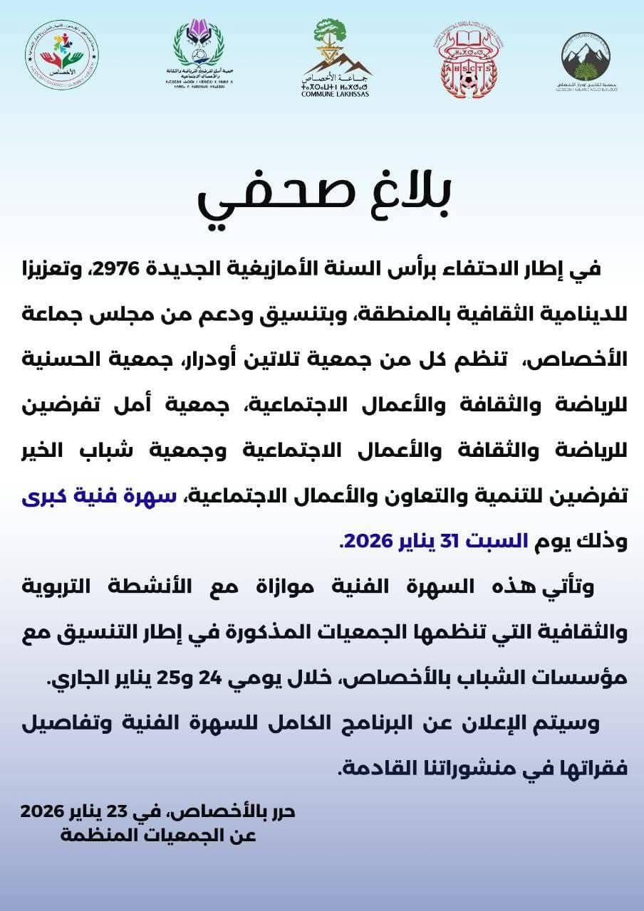 في إطار الاحتفاء برأس السنة الأمازيغية الجديدة 2976، وتعزيزا للدينامية الثقافية والفنية التي تعرفها المنطقة، تنظم مجموعة من الجمعيات النشيطة بجماعة الأخصاص، وبدعم وتنسيق مع مجلس جماعة الأخصاص، سهرة فنية كبرى وذلك يوم السبت 31 يناير 2026.