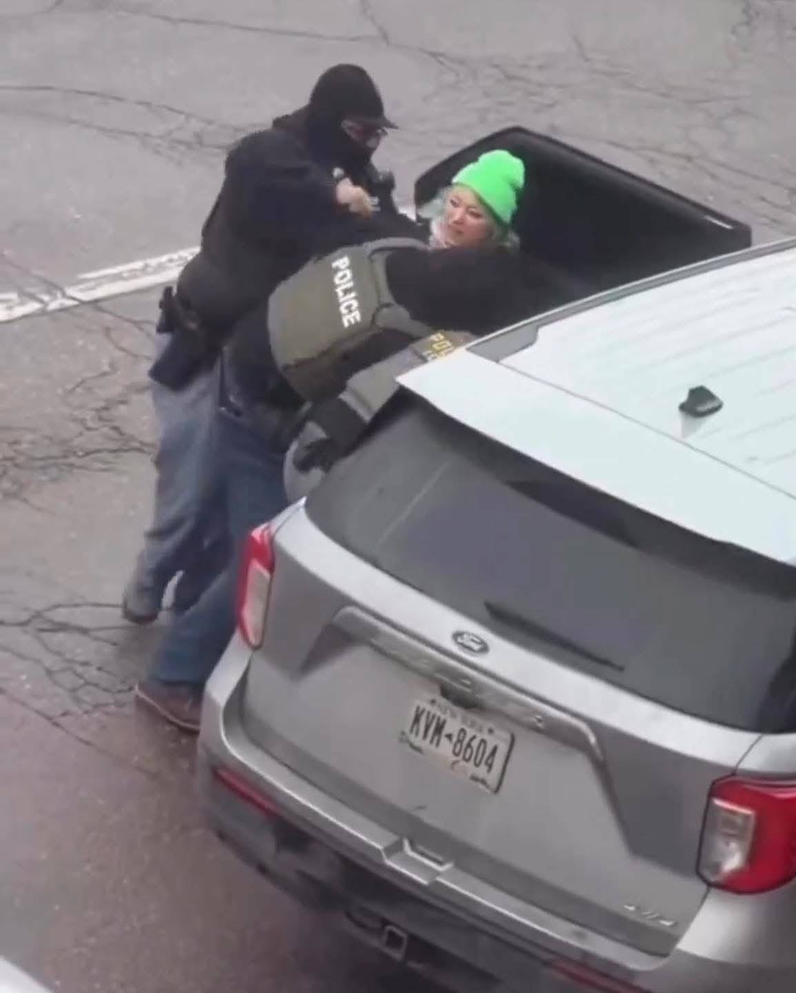 فشل احتجاج أمام القانون: ناشطة ذات شعر أخضر تعرقل ICE وتهرب… قبل أن تُمسك بها العدالة الفيدرالية