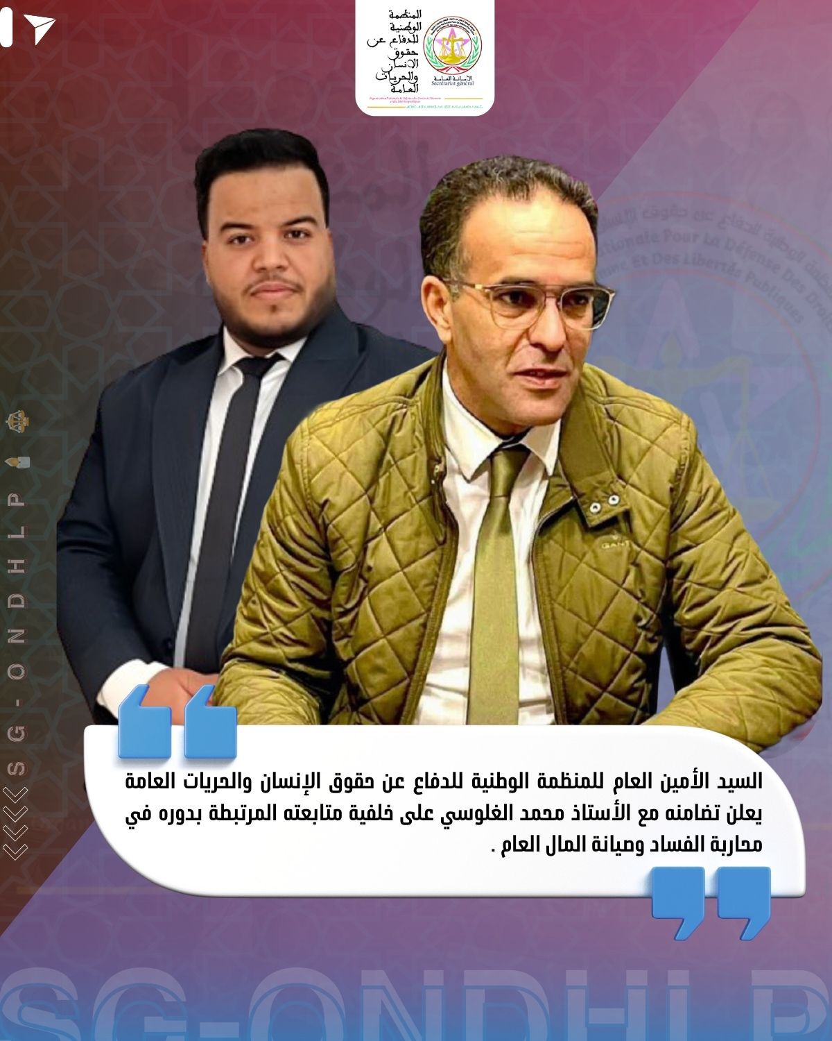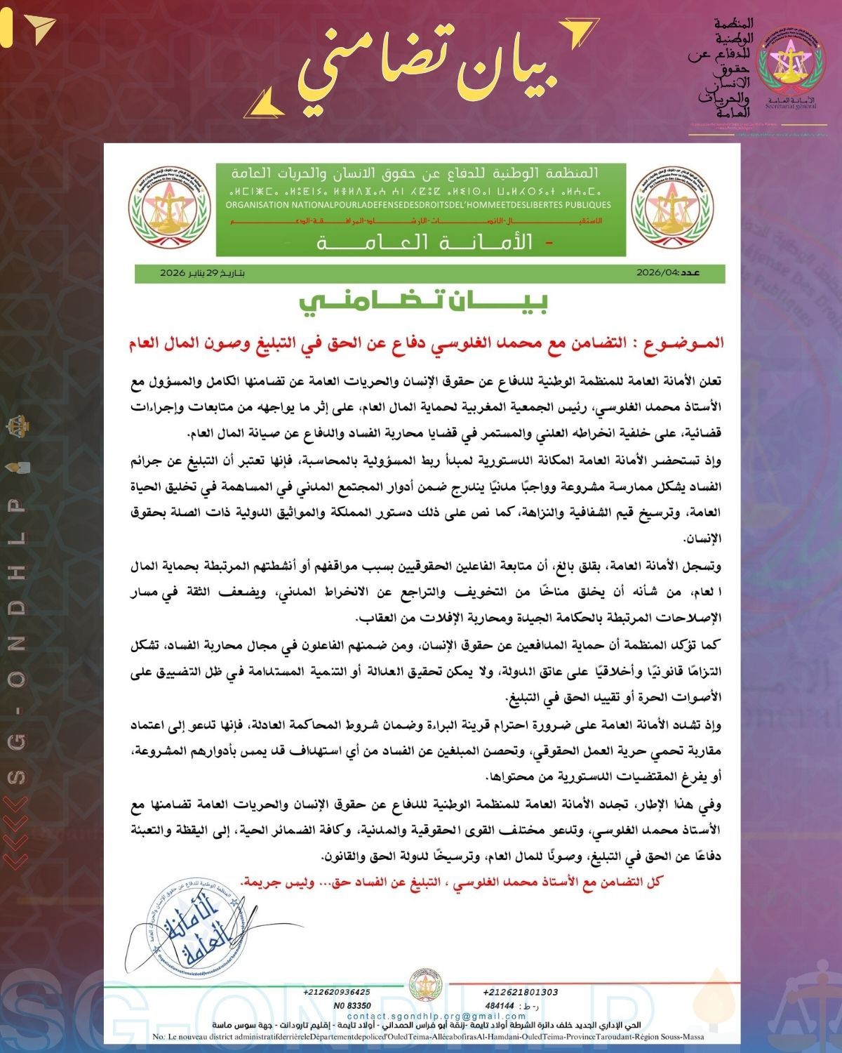 تعبر المنظمة الوطنية للدفاع عن حقوق الإنسان والحريات العامة عن تضامنها الكامل واللامشروط مع الأستاذ محمد الغلوسي، رئيس الجمعية المغربية لحماية المال العام، على خلفية ما يتعرض له من متابعات وإجراءات قضائية مرتبطة بانخراطه العلني والمستمر في قضايا محاربة الفساد والدفاع عن صيانة المال العام.