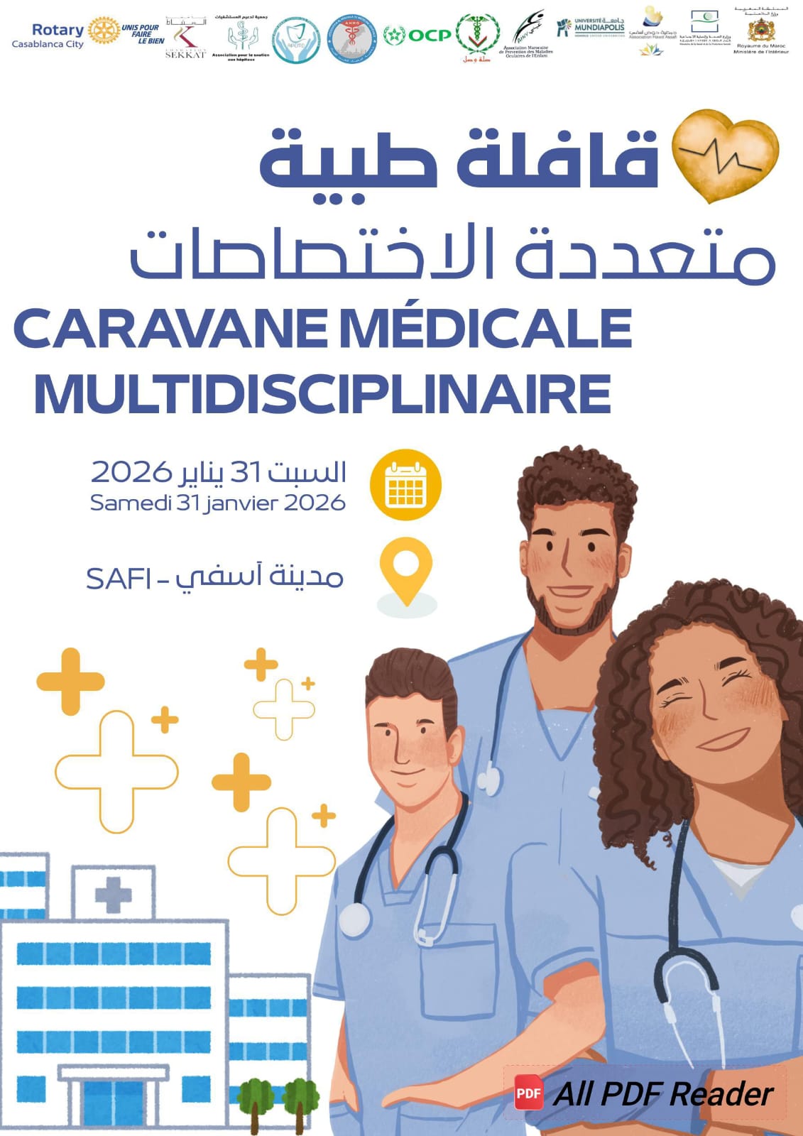 تحت إشراف إقليم اسفي بجهة مراكش آسفي ومندوبية الصحة والحماية الاجتماعية بإقليم آسفي، تنظم جمعية نادي روطاري الدار البيضاء المدينة وجمعية نادي روطاري آسفي عبدة ونادي روطاري فيرمني بفرنسا وجمعية حوض آسفي وجمعية الأطباء صلة وصل وجمعية أطباء الأسنان لب الأمل قافلة طبية متعددة الاختصاصات بمستشفى عائشة بمدينة اسفي يوم 31 يناير2026.