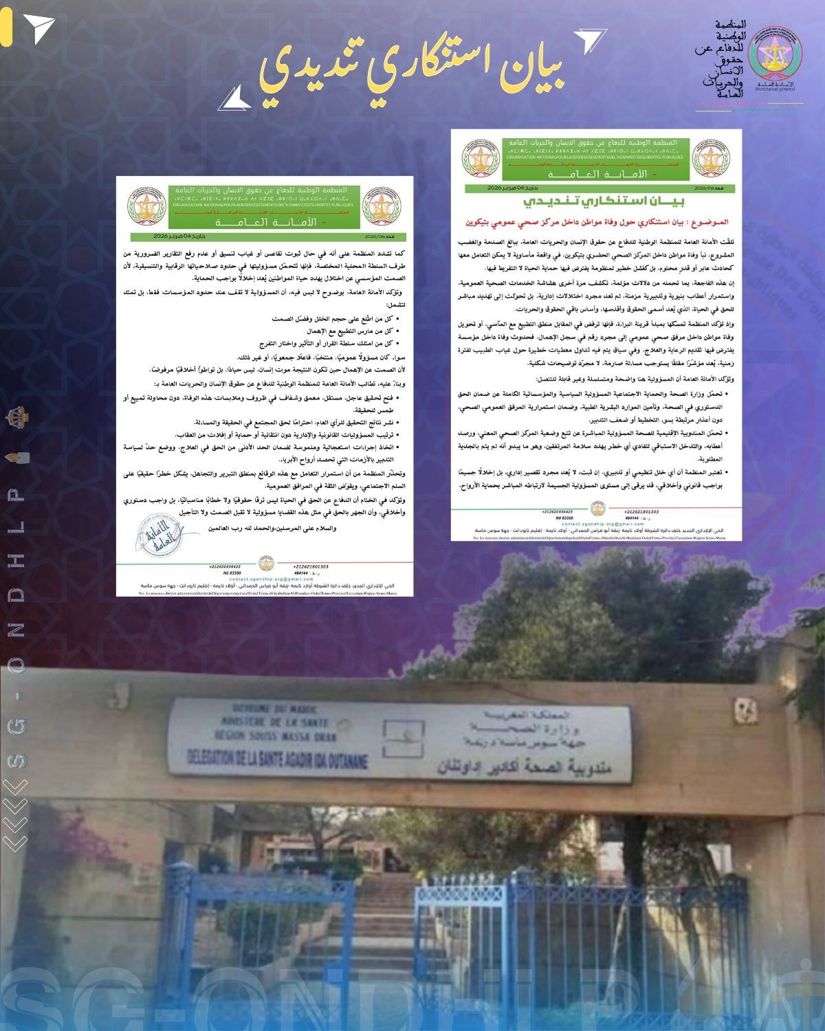 وطالبت المنظمة الجهات الوصية باتخاذ تدابير استعجالية لضمان استمرارية المرفق العمومي الصحي، وتوفير الأطر الطبية والتمريضية اللازمة، مع تعزيز آليات المراقبة والتتبع، تفاديًا لتكرار مثل هذه المآسي التي تهز ثقة المواطنين في المنظومة الصحية العمومية.
