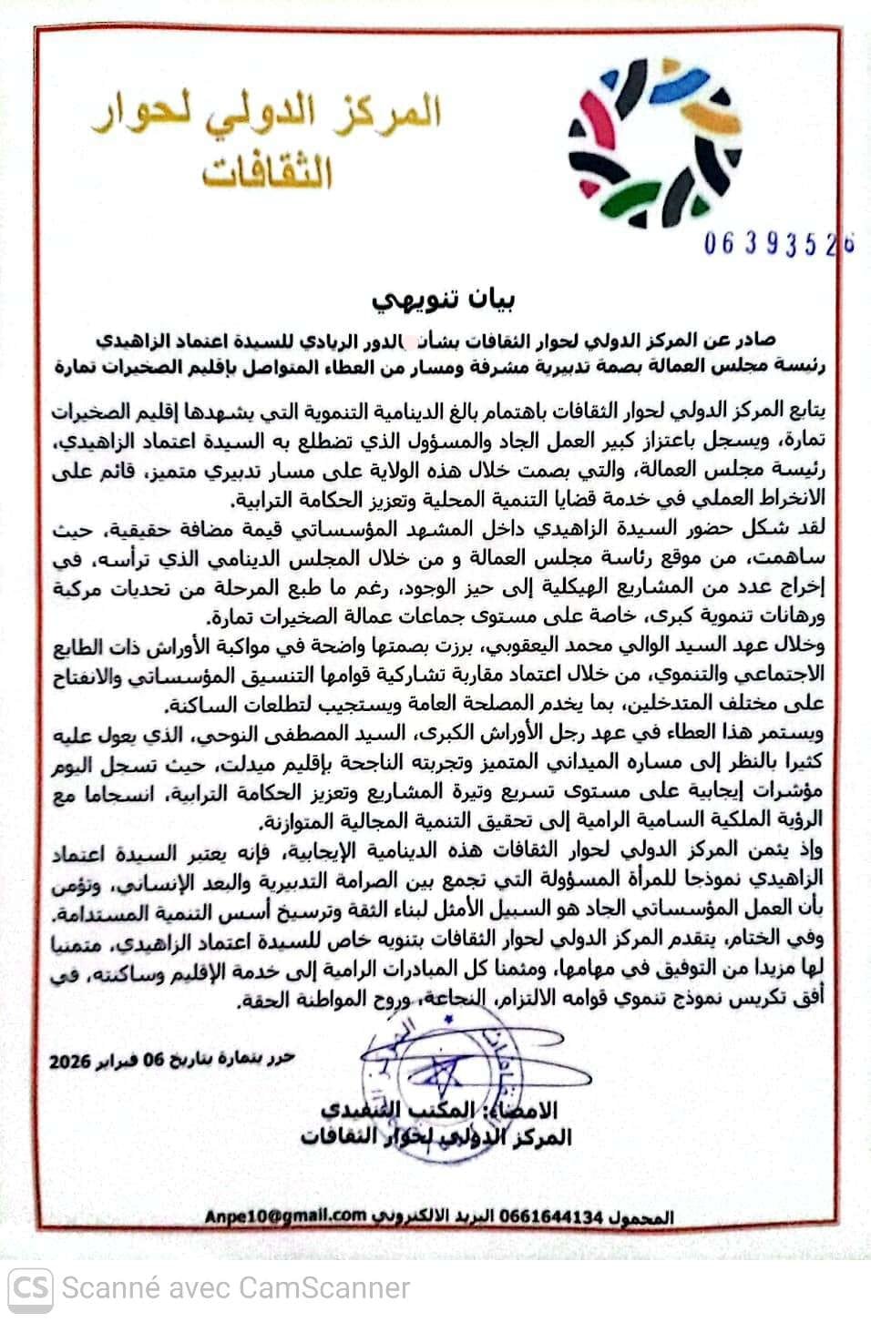 وفي الختام، يتقدم المركز الدولي لحوار الثقافات بتنويه خاص للسيدة اعتماد الزاهيدي، متمنيا لها مزيدا من التوفيق في مهامها، ومثمنا كل المبادرات الرامية إلى خدمة الإقليم وساكنته، في أفق ترسيخ نموذج تنموي قوامه الالتزام، النجاعة، وروح المواطنة الحقة.