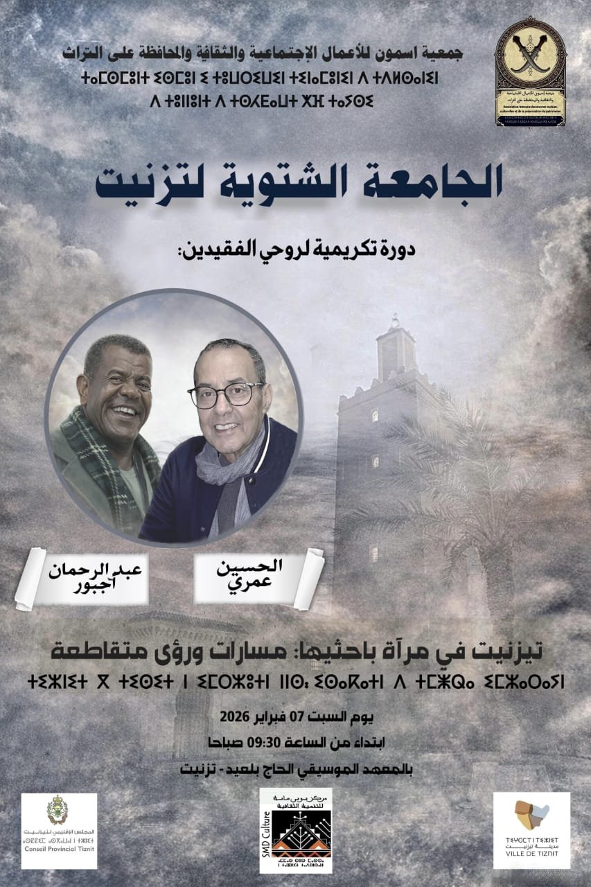 تحتضن مدينة تيزنيت يوم السبت7 فبراير 2026، الدورة الـ 11 للجامعة الشتوية بالمعهد الموسيقي الرايس الحاج بلعيد من تنظيم جمعية اسمون للأعمال الاجتماعية والثقافية والمحافظة على التراث، بدعم من مركز سوس ماسة للتنمية والمجلسين الجماعي والإقليمي لتيزنيت، وذلك تحت موضوع: