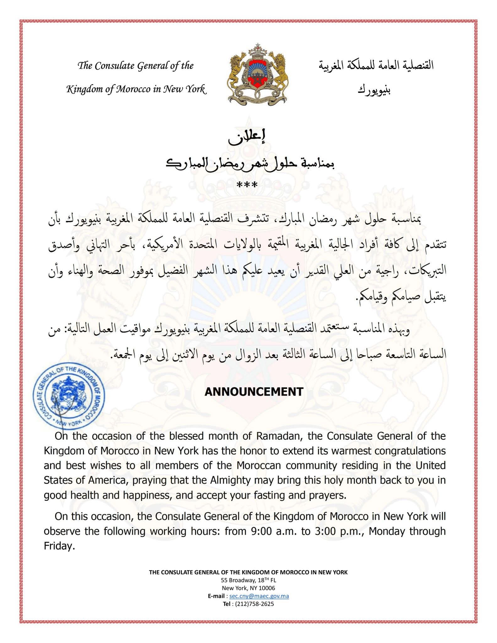 القنصلية العامة للمملكة المغربية بنيويورك تعلن توقيت العمل خلال شهر رمضان المبارك