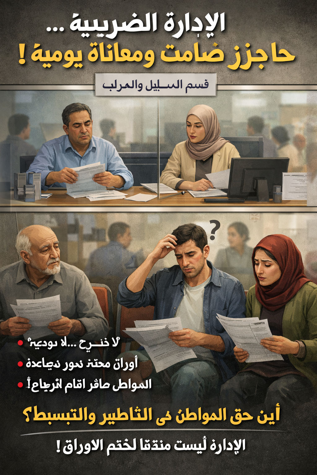 يطرح عدد من المواطنين تساؤلات مشروعة حول طريقة اشتغال بعض موظفي قسم السجل التجاري والمصالح الضريبية، حيث يشتكي المرتفقون من الاكتفاء بالجلوس وراء الزجاج دون تقديم شروحات كافية أو توجيه واضح، مع تسليم مطبوعات يُطلب من المواطن ملؤها دون أي مواكبة.