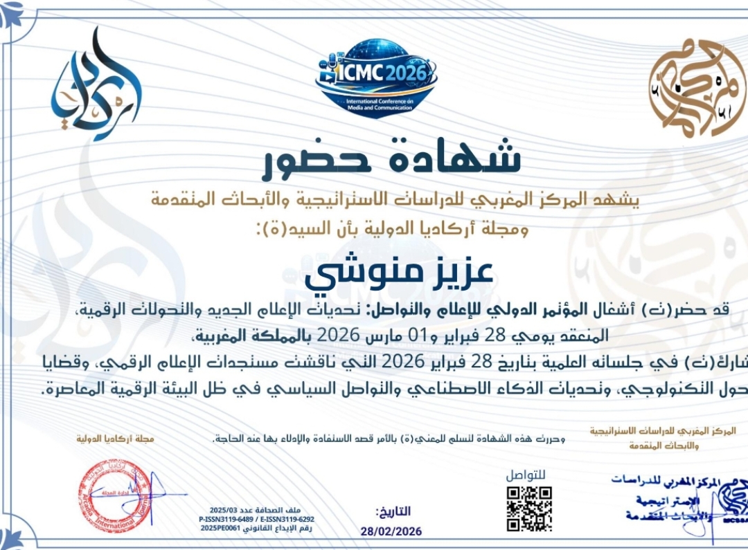 وقد توصل الأستاذ عزيز منوشي بشهادة حضور رسمية من اللجنة المنظمة، تقديراً لمشاركته الفاعلة واهتمامه بالقضايا العلمية المطروحة، خاصة ما يتعلق بإشكالات الممارسة الصحافية في العصر الرقمي، وأدوار الإعلام في مواكبة التحولات المجتمعية والتكنولوجية.