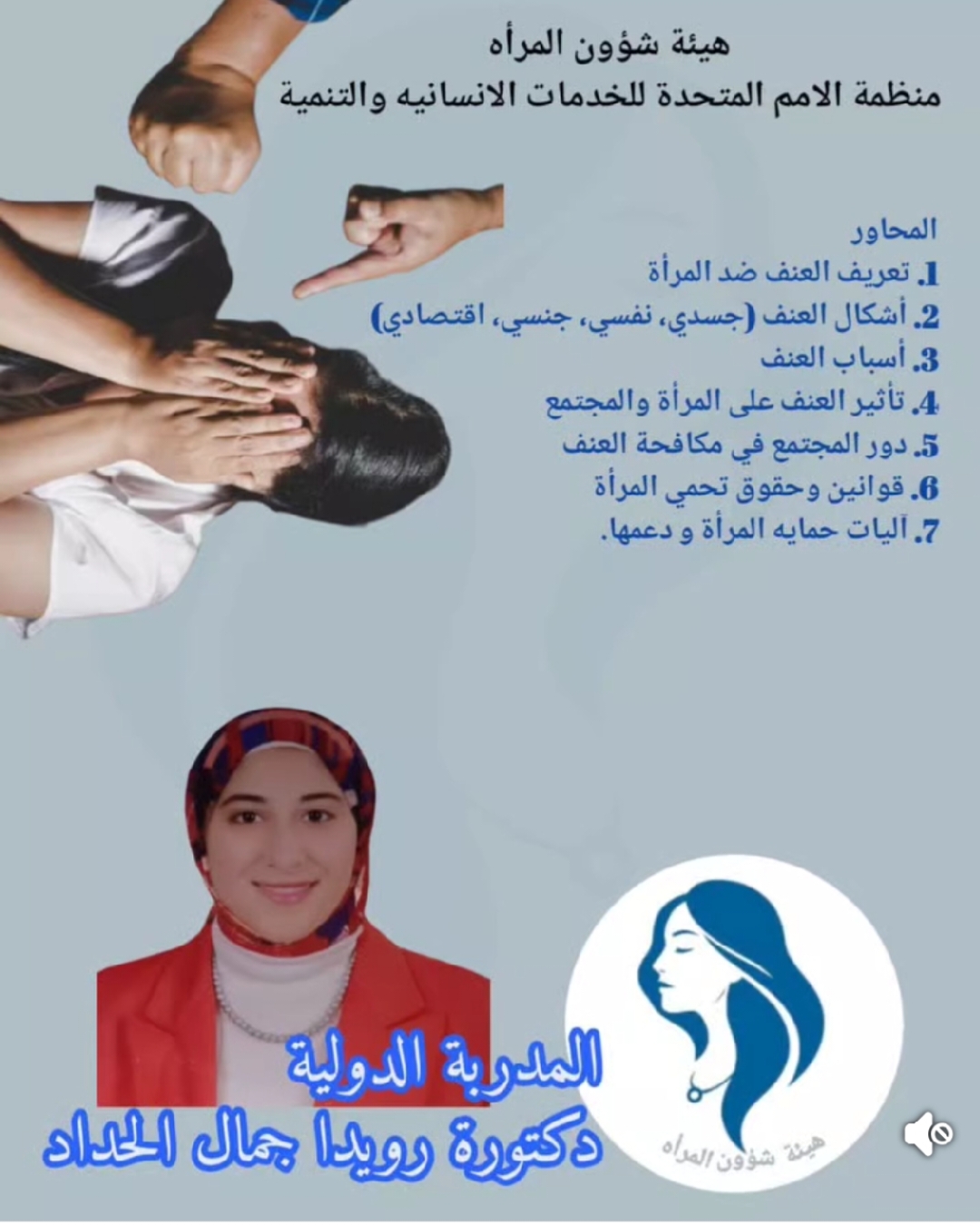 في إطار الجهود الرامية إلى نشر الوعي بقضايا المرأة وتعزيز ثقافة مناهضة العنف، نظمت منظمة الأمم المتحدة للخدمات الإنسانية والتنمية لقاءً دولياً حول ظاهرة العنف ضد المرأة، أشرفت عليه الدكتورة رويدا جمال الحداد من مصر، وذلك بمشاركة عدد من الفاعلين والمهتمين بالشأن الاجتماعي والحقوقي من عدة دول.