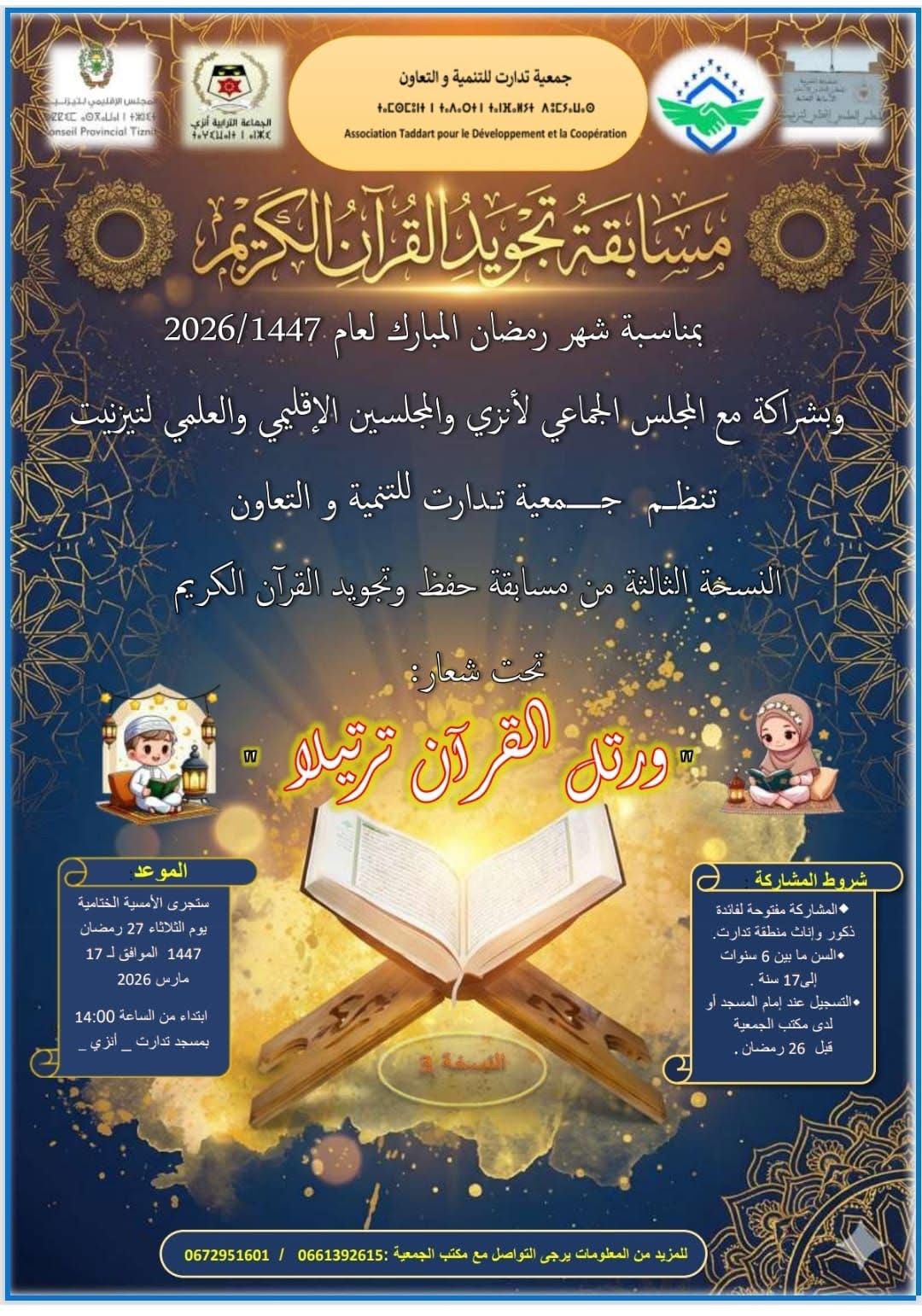 بمناسبة شهر رمضان المبارك لعام 1447 هـ / 2026 م، تنظم جمعية تدارت للتنمية والتعاون النسخة الثالثة من مسابقة في حفظ وتجويد القرآن الكريم، وذلك بشراكة مع المجلس الجماعي لأنزي والمجلس الإقليمي لتزنيت والمجلس العلمي المحلي لتزنيت.